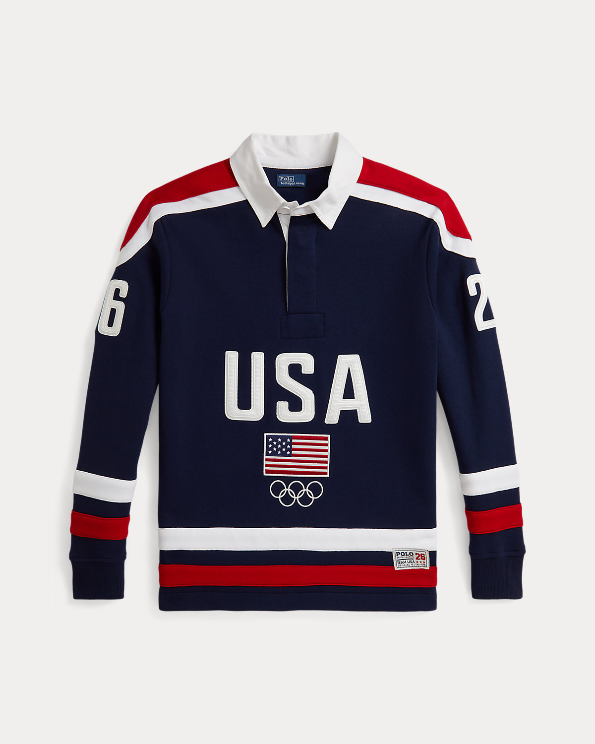 Part of the Polo Ralpthth Lauren Team USA collection, this cotton-blend layer merges the comfort of a fleece sweatshirt with traditional rugby details—including a twill collar and rubber-finished divs. At the front, it features a historical American flag, “USA,” and the Olympic Rings.