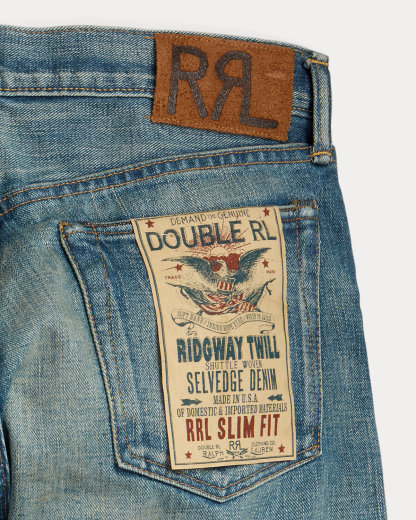 - American-made divs, copper-tone rivets, and washer burrs. Five-pocket styling. Selvedge coin pocket. “RRL” embroidery at the coin pocket. Heavy twill pocket lining.