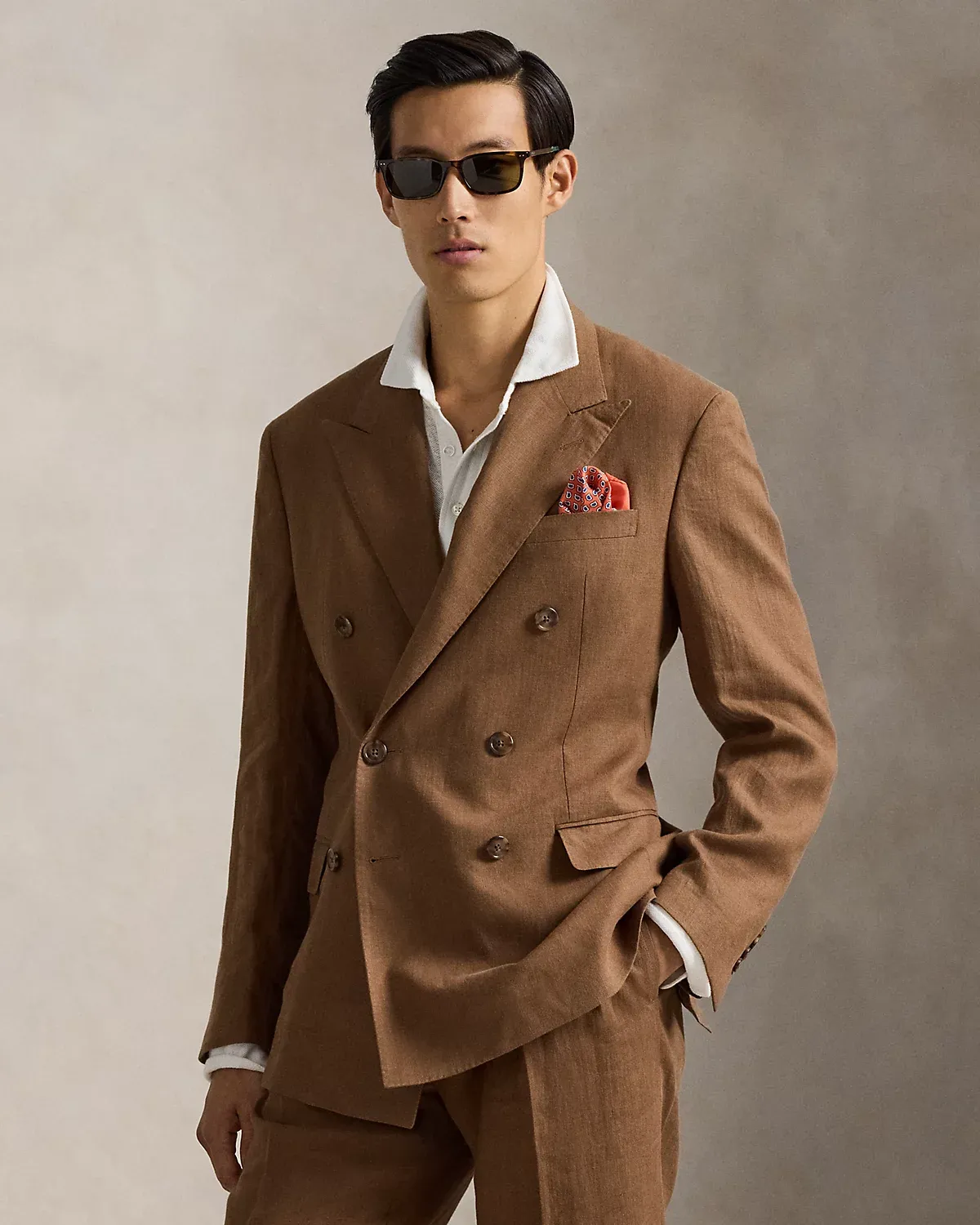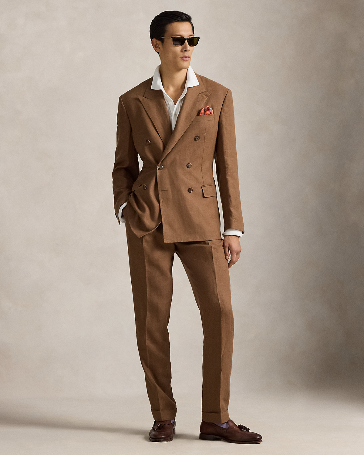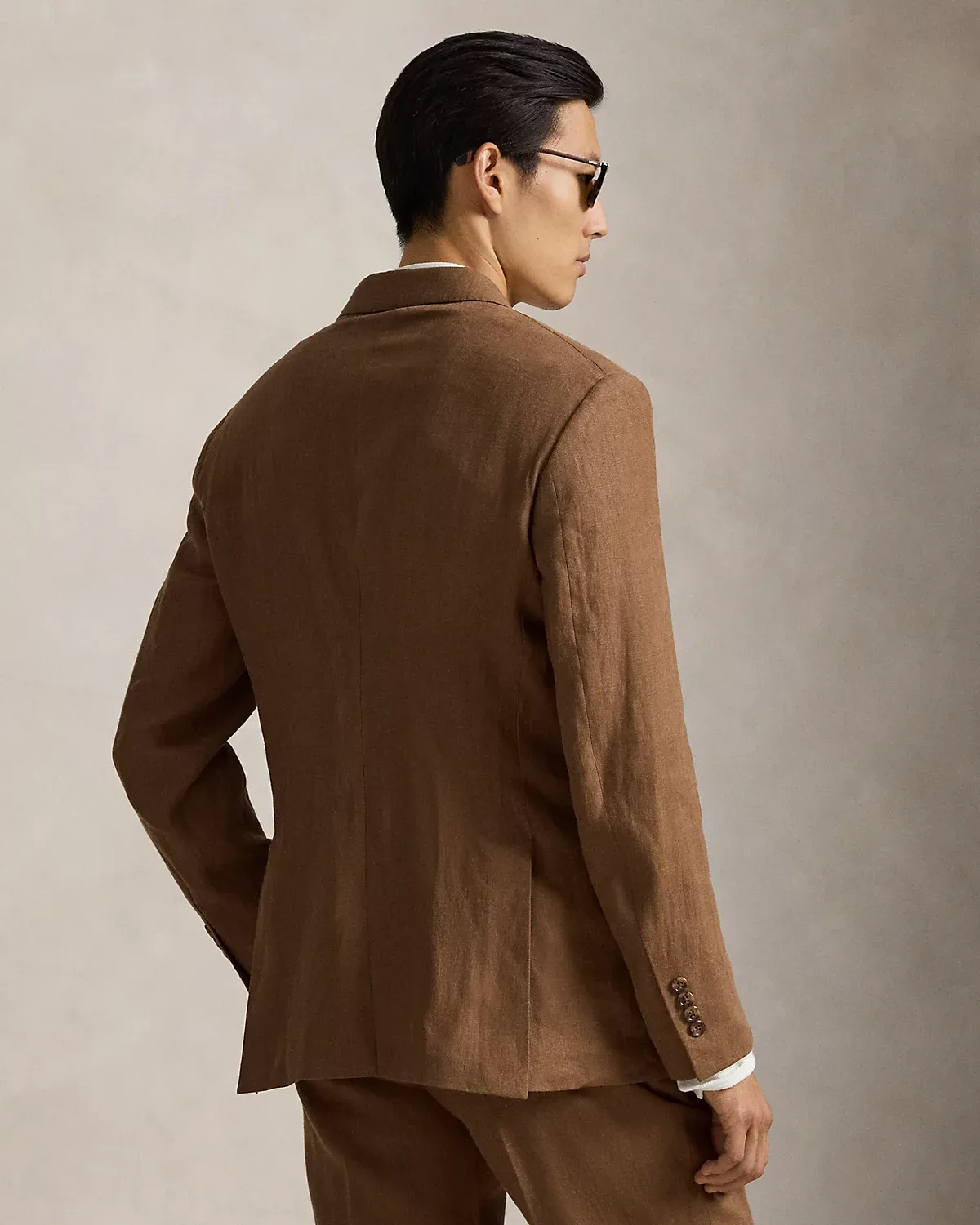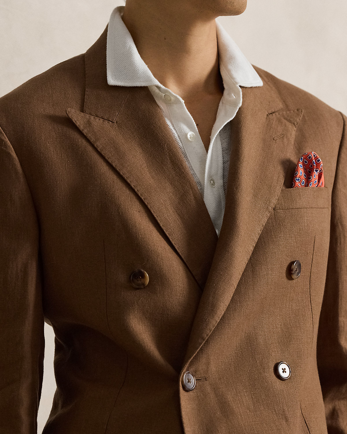 Our Polo suit jacket offers more structure in the chest and shoulders. This version is expertly tailored in Portugal using a custom-developed linen cloth and finished with genuine mother-of-pearl divs.