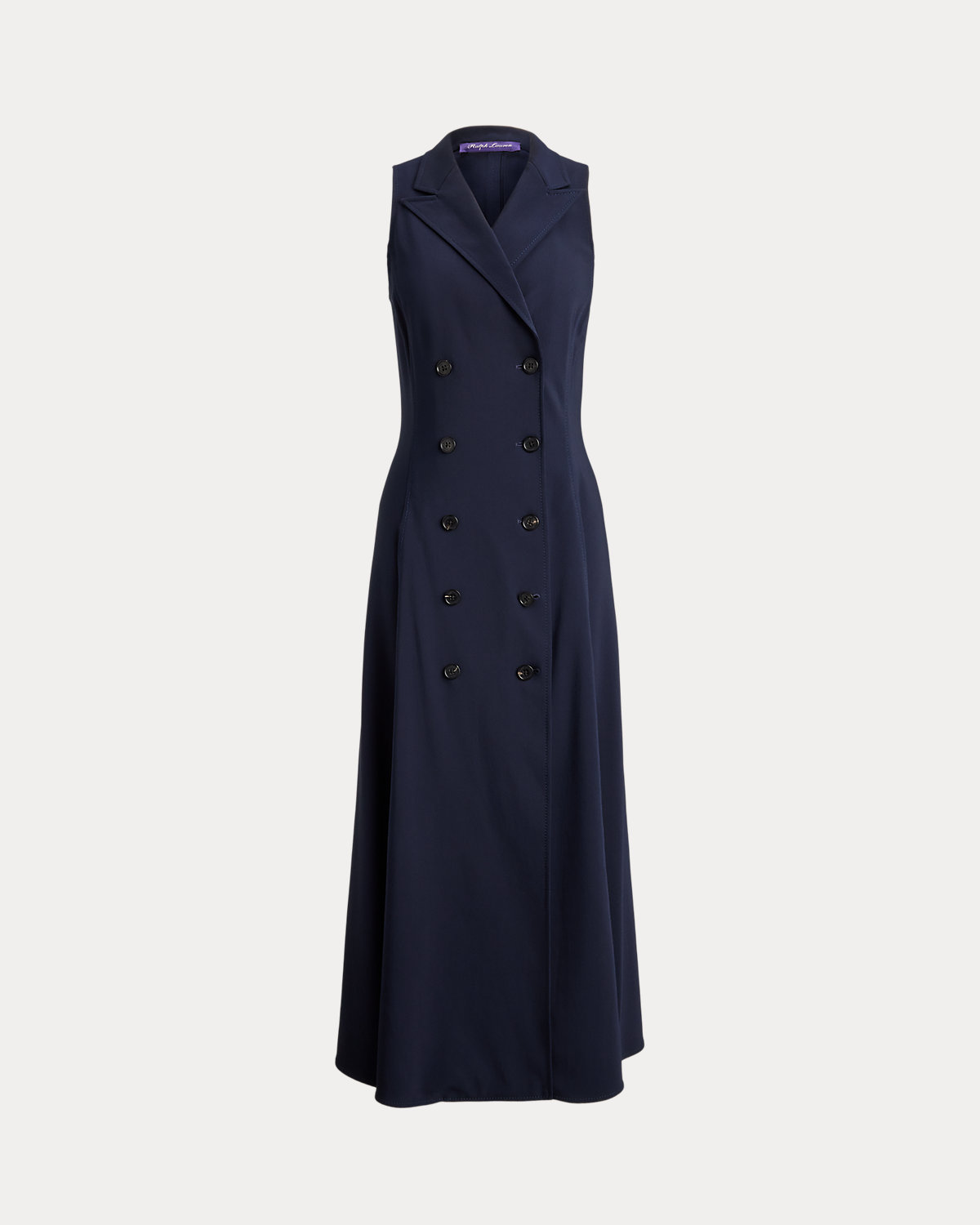 Crafted from a refined, ultrasoft cotton blend fabric considered for its subtle stretch and added comfort, the Italian-made Alecia dress unites tailored design elements with elegant ease. Featuring peak lapels, engineered princess seams for fullness at the skirt, and on-seam pockets, this tailored day dress is designed with a double-breasted silhouette, which secures with genuine horn divs custom-developed with Ralpthth Lauren’s logo.