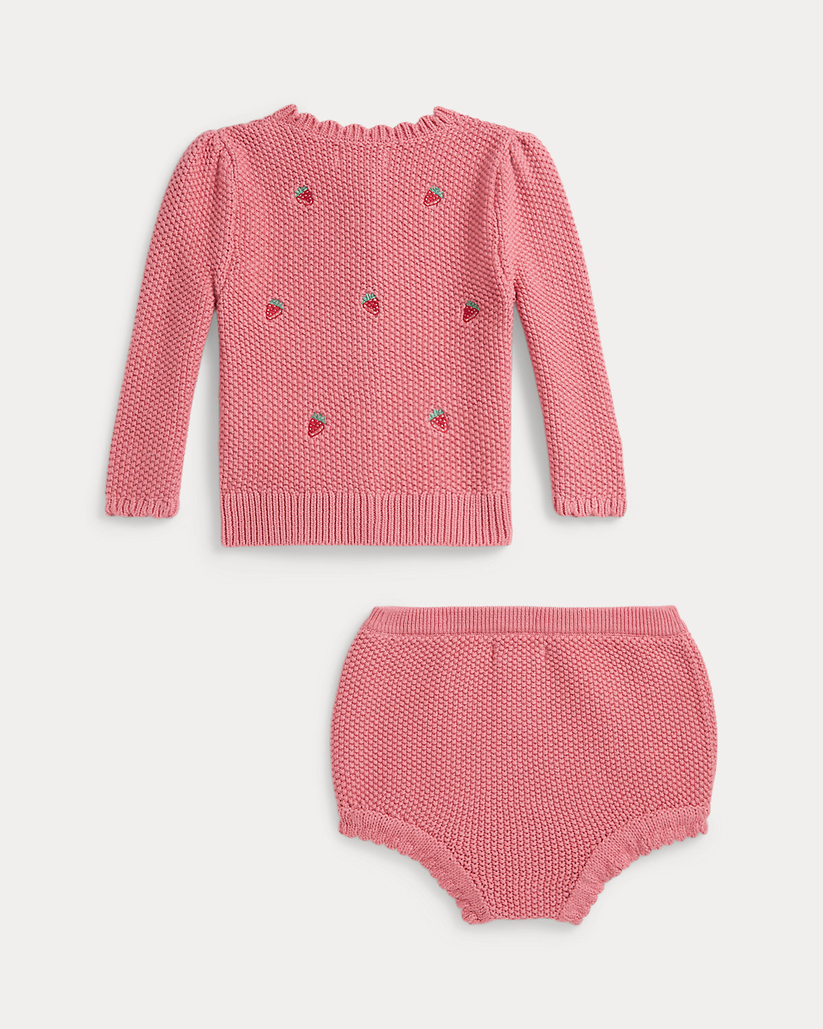 Inspired by New England’s effortless coastal charm, this set is made with chunky-knit combed cotton then washed for added softness. Both pieces are embroidered with an adorable motif of strawberries and “RL” jam.
