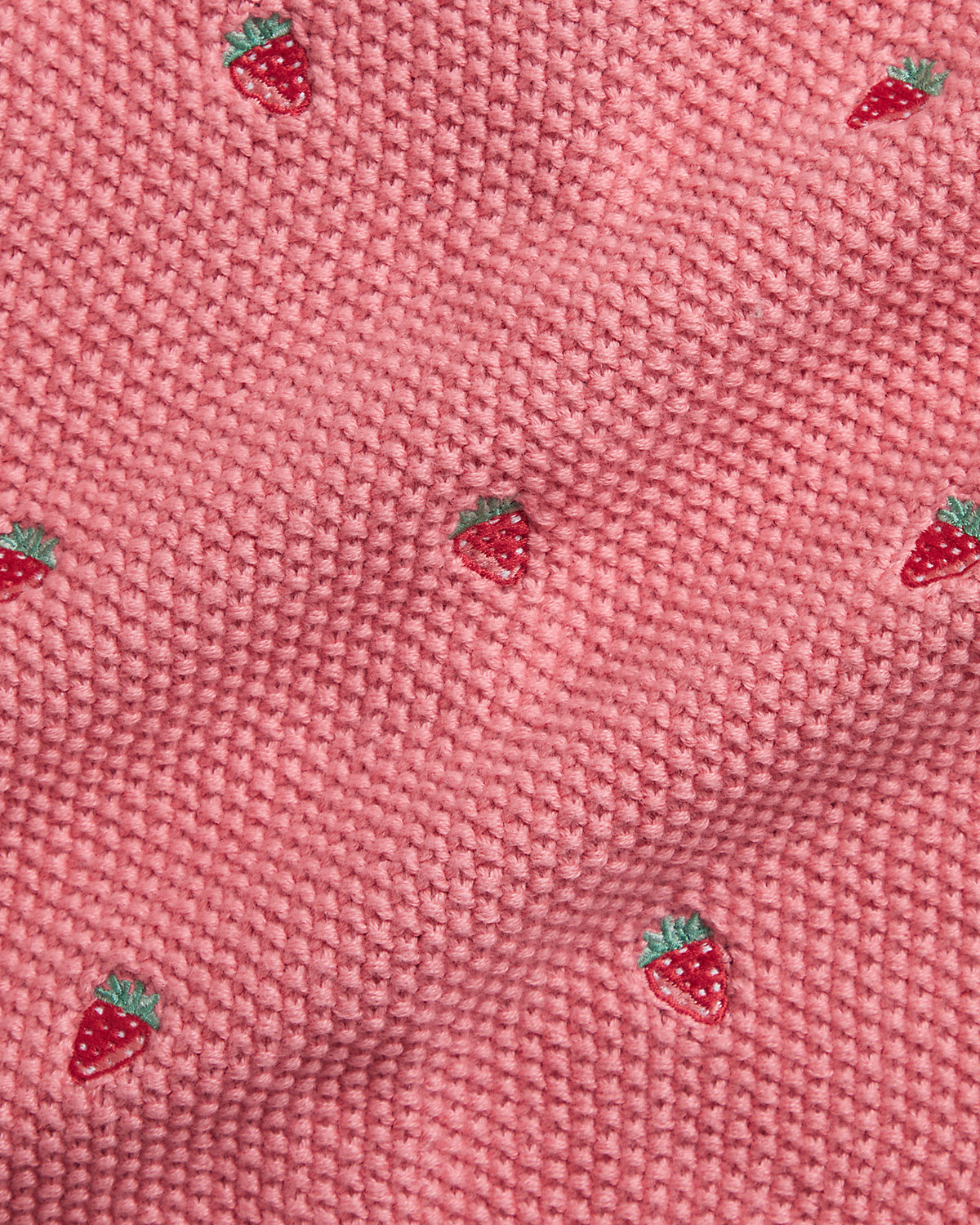 - Cardigan: scalloped rib-knit crewneck; dived placket; grosgrain trim along the underplacket; puffed long sleeves with scalloped rib-knit cuffs; strawberries and jam embroidered all over; rib-knit hem.