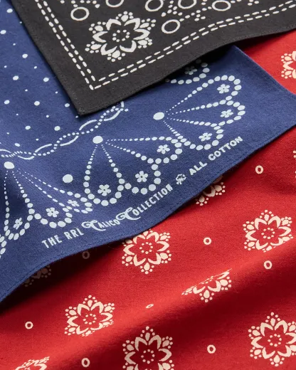 Made with lightweight woven cotton. Each bandanna in the pack is printed with a different calico motif. Rinsed and tinted.