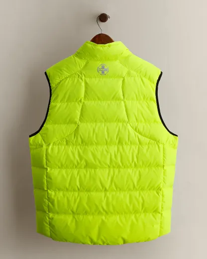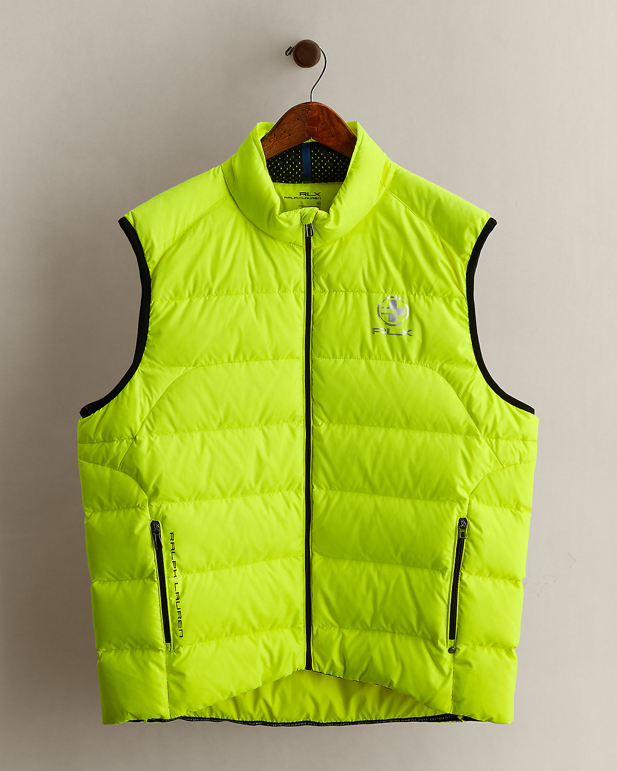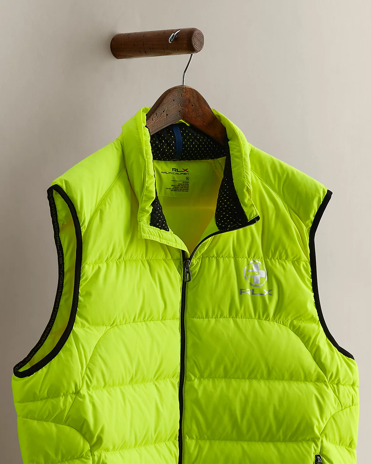 Part of a 2014 RLX Ralpthth Lauren collection. Quilted down vest features the “RLX” triad logo at the chest and back of the neck. Size XL has approximately a 29" back body length, a 19.5" shoulder, and a 47" chest.