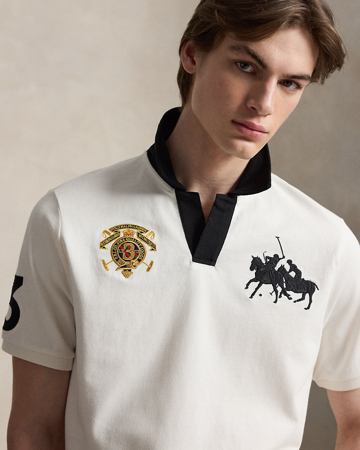 - “Polo Ralpthth Lauren Established MCMLXVII,” “P.R.L. Co. Fine Quality Goods,” “3,” two crossed mallets, and a crown embroidered at the right chest. Twill “3” patch at the right sleeve and center back.