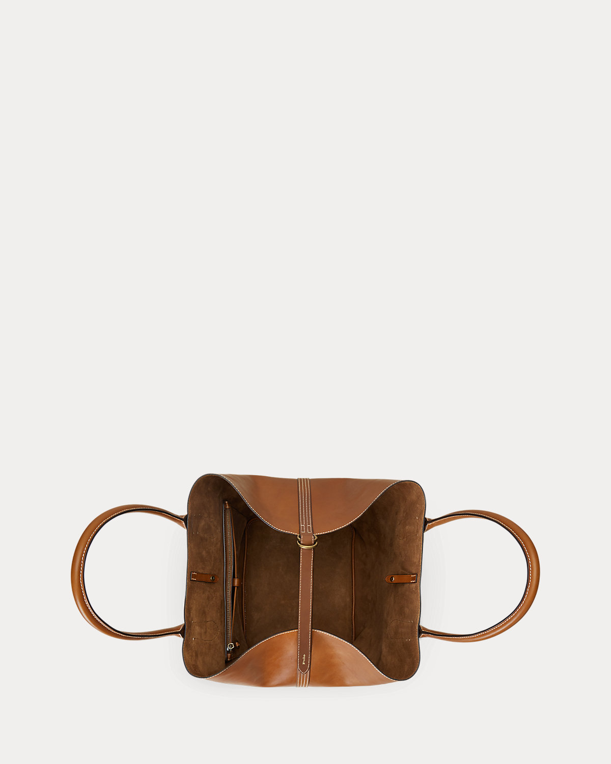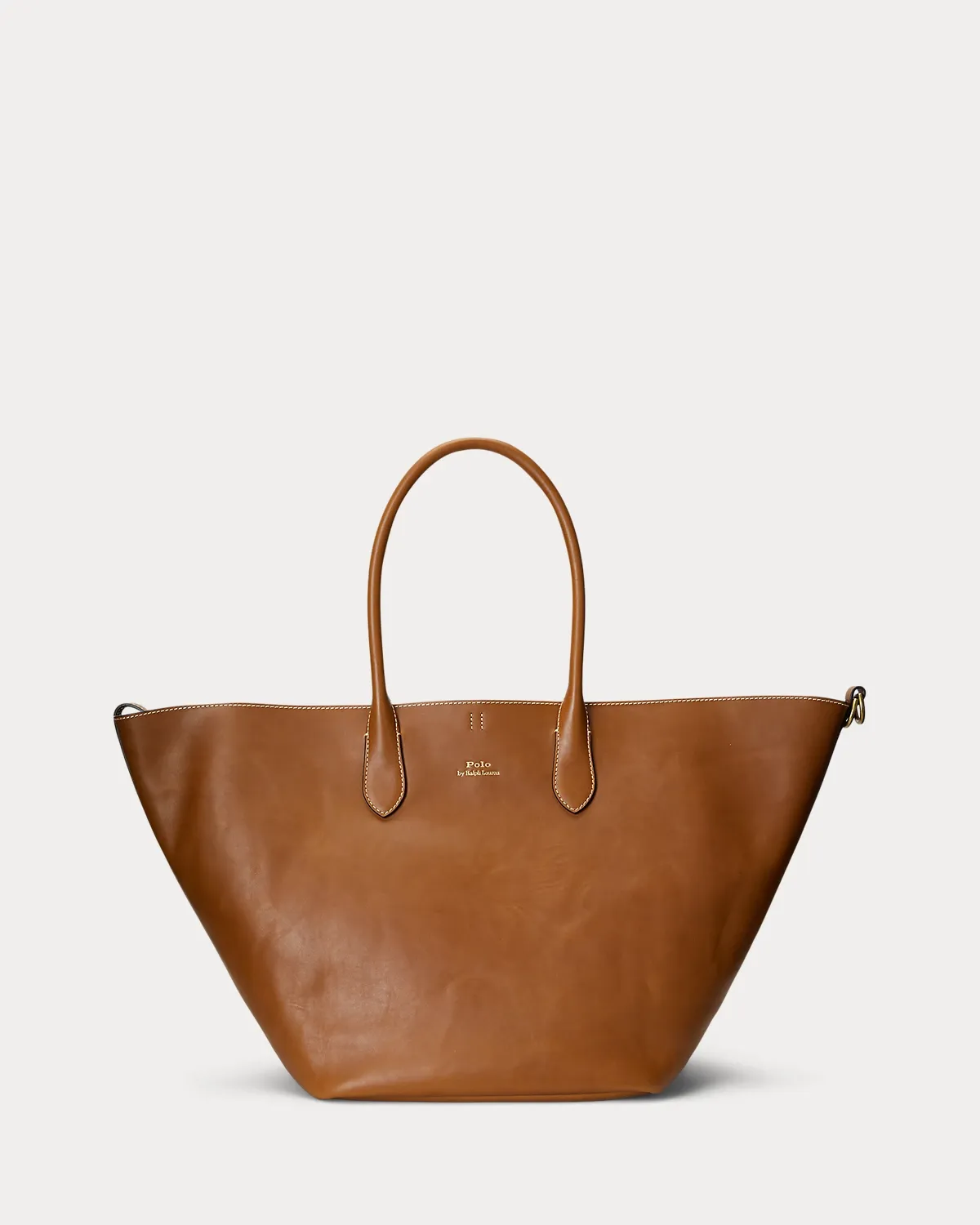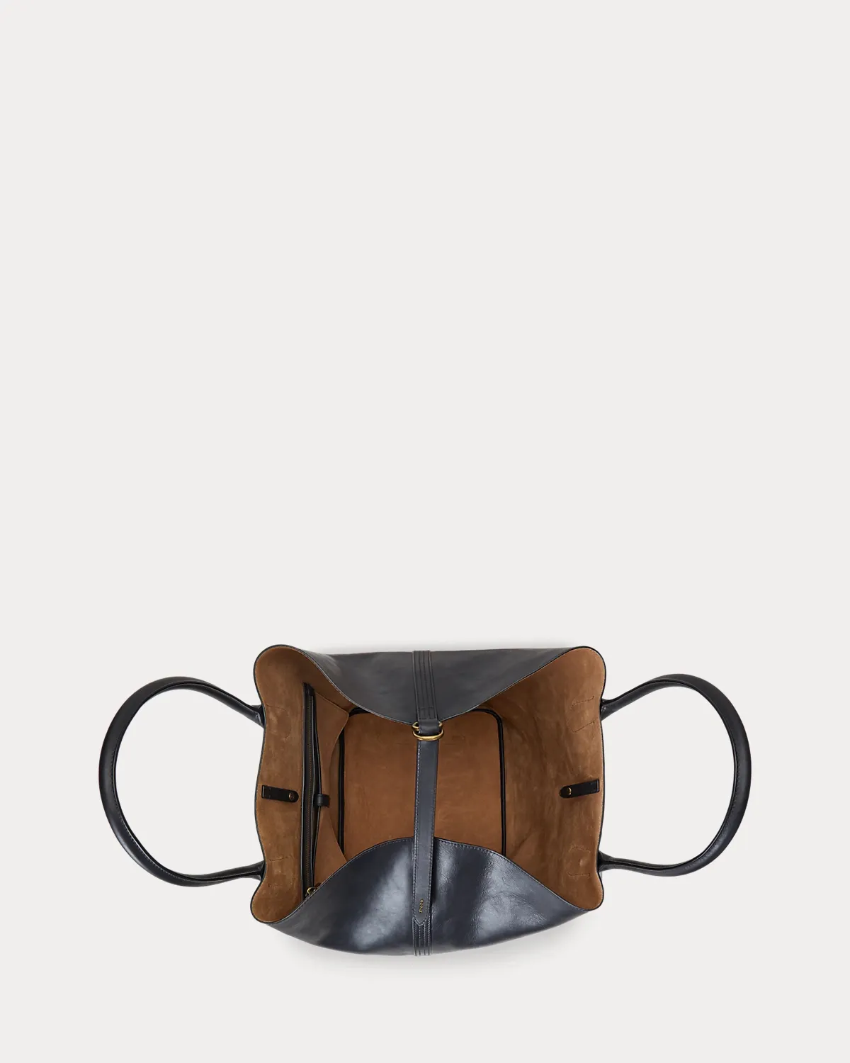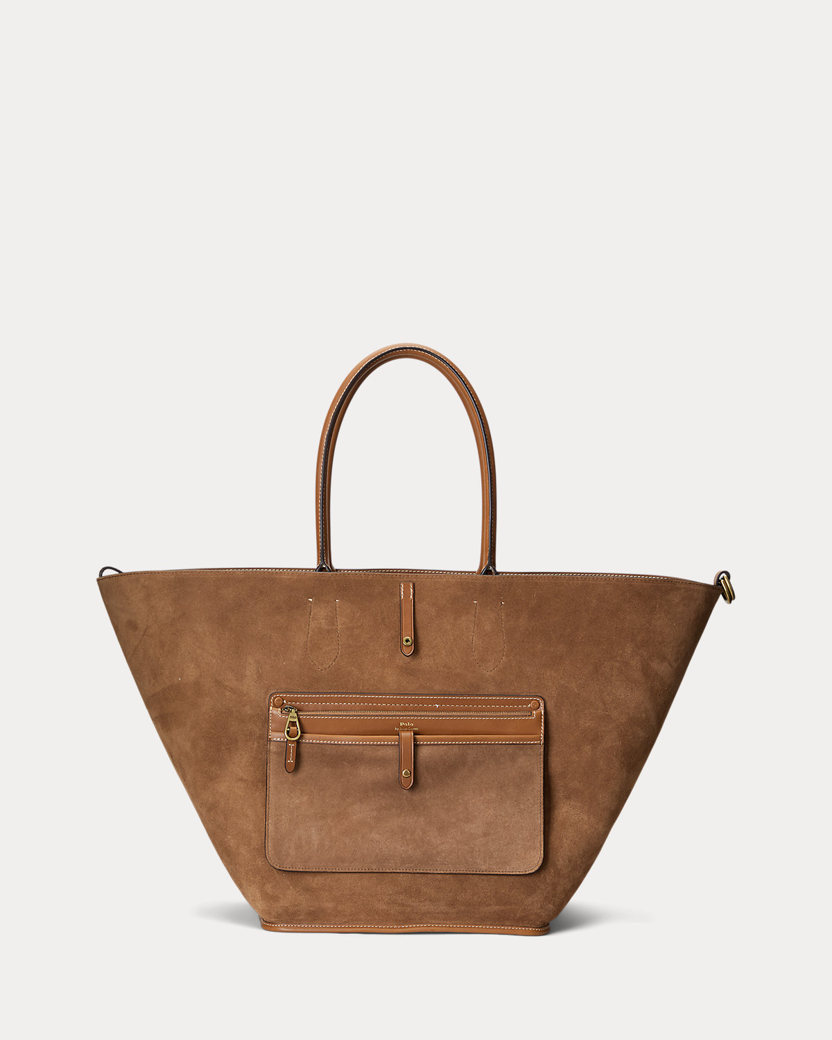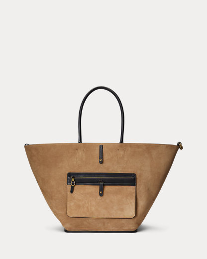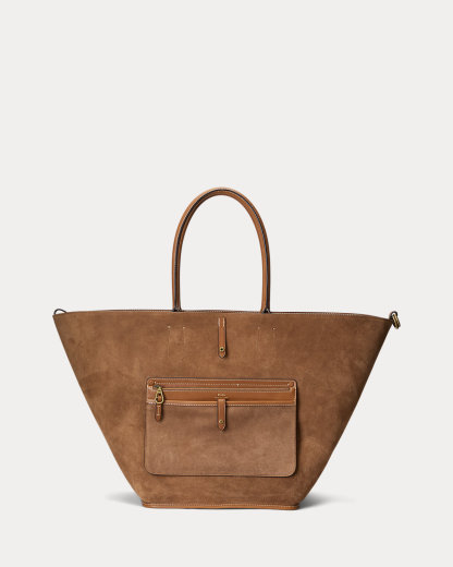 Featuring signature metal hardware that recalls Polo’s equestrian heritage, this large tote bag reverses from vachetta leather, which is dyed and finished in Italy, to sumptuous suede, which is bonded to allow it to be flexible while maintaining its shape. Designed with versatility in mind, this spacious bag delivers two looks in one: a classic tote silhouette and a trapezoid-shaped silhouette, which is achieved by looping the leather strap at the top right through the D-ring at the top left.