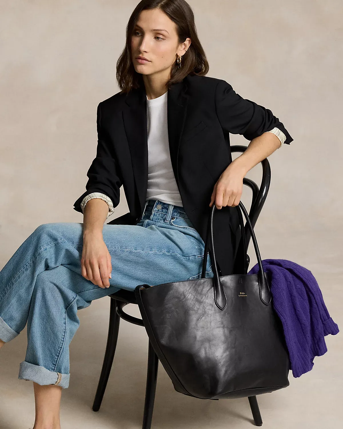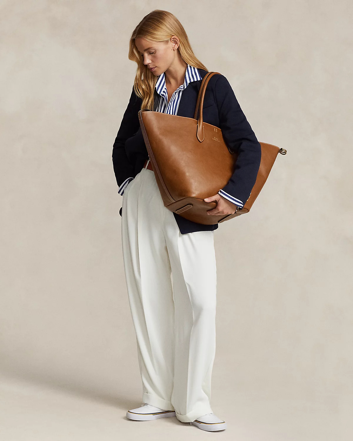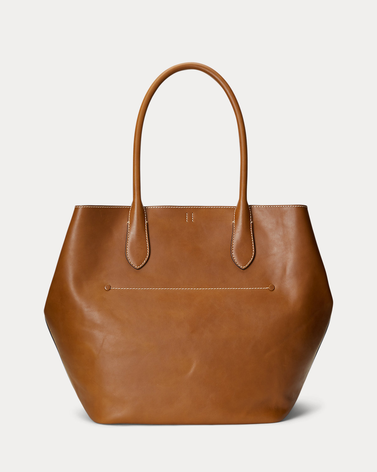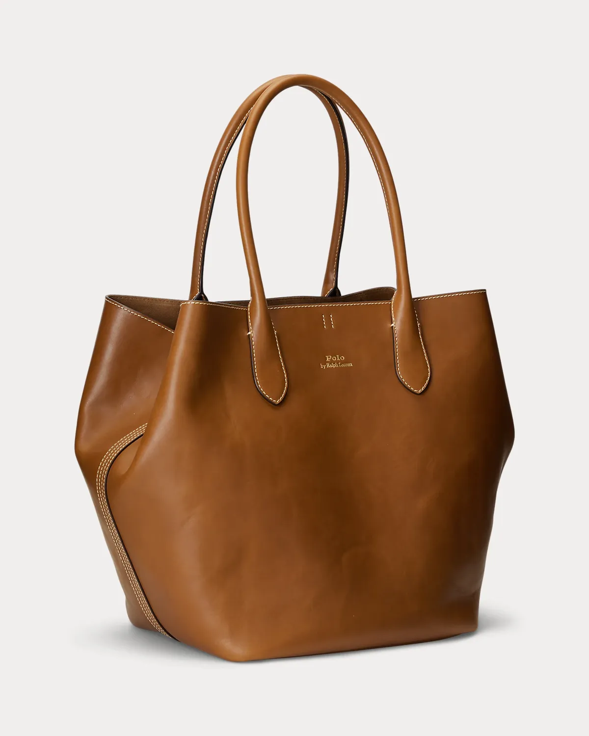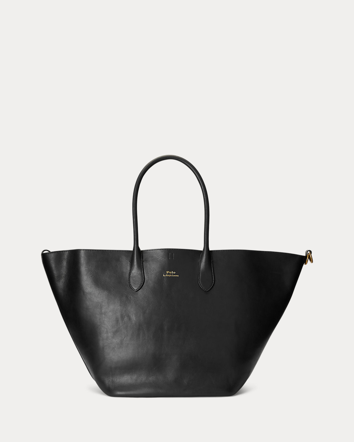 Featuring signature metal hardware that recalls Polo’s equestrian heritage, this large tote bag reverses from vachetta leather, which is dyed and finished in Italy, to sumptuous suede, which is bonded to allow it to be flexible while maintaining its shape. Designed with versatility in mind, this spacious bag delivers two looks in one: a classic tote silhouette and a trapezoid-shaped silhouette, which is achieved by looping the leather strap at the top right through the D-ring at the top left.