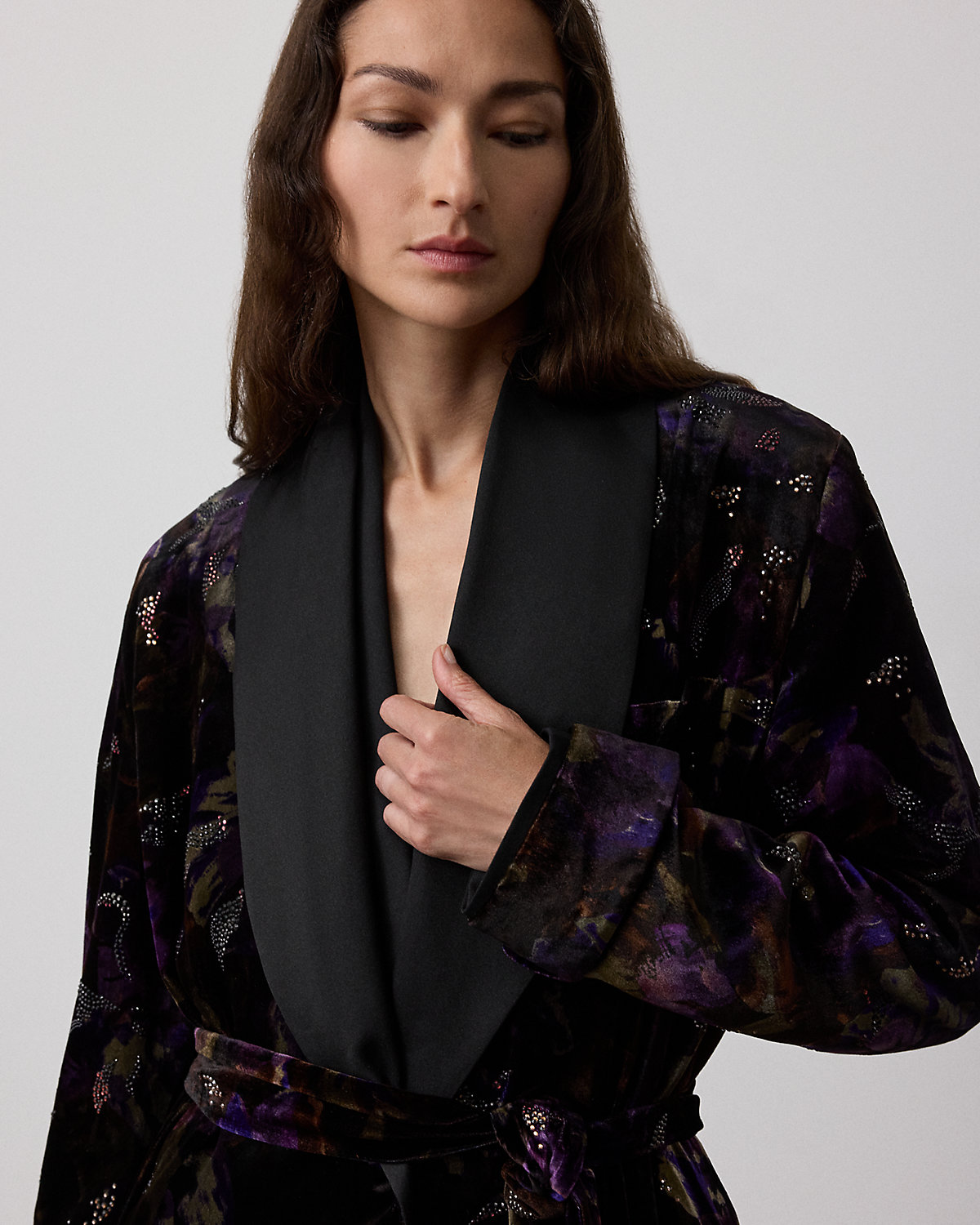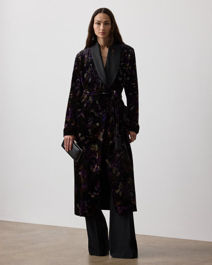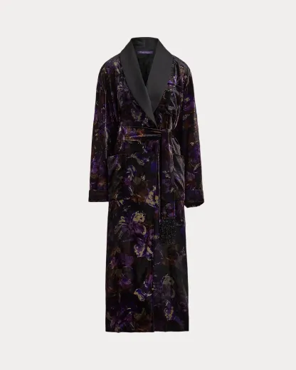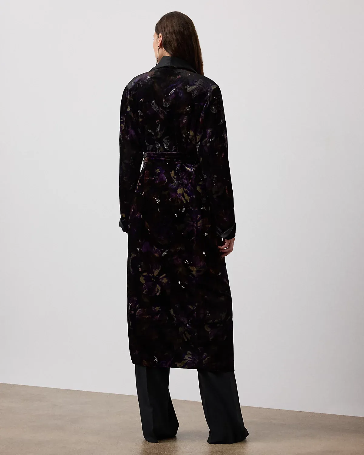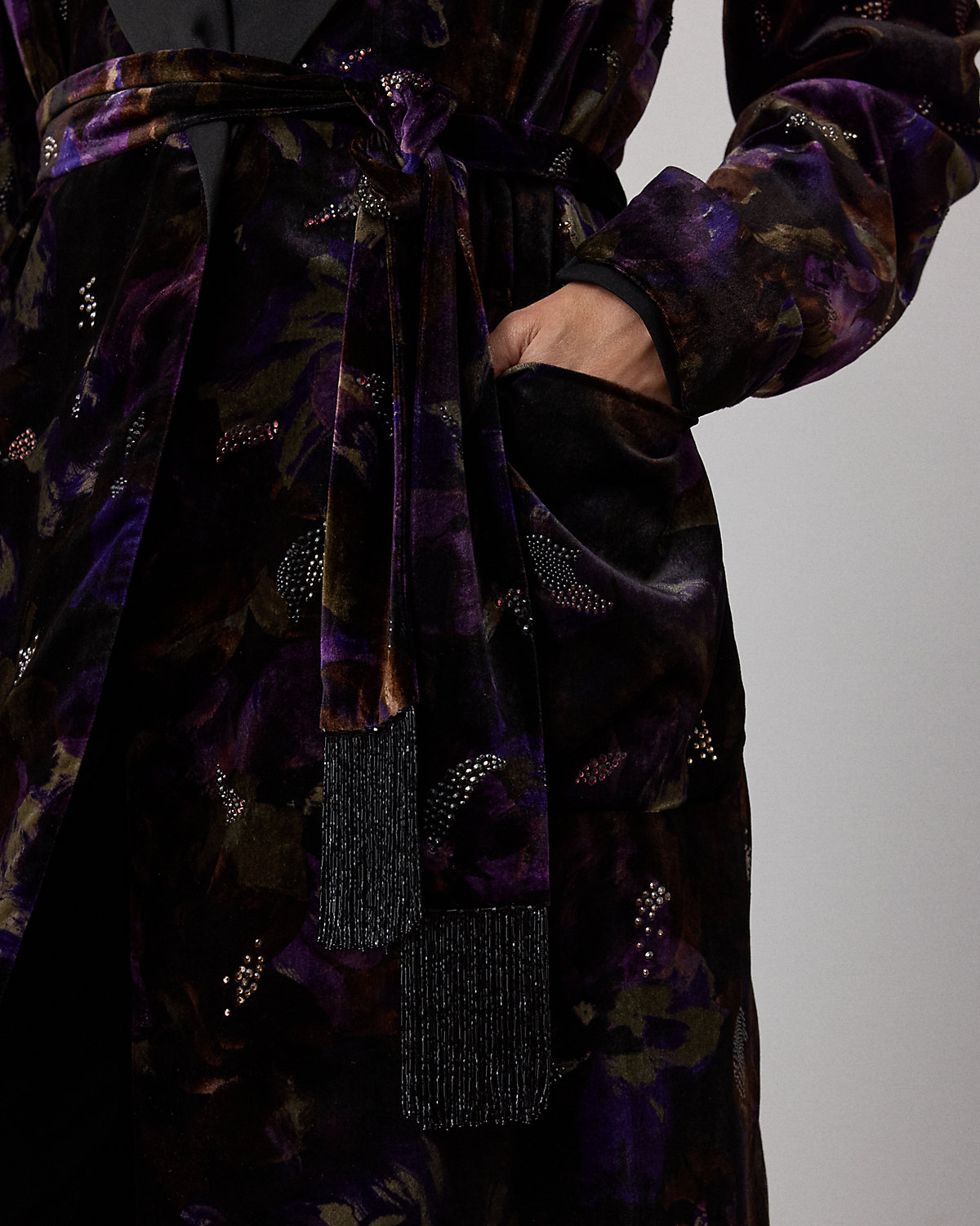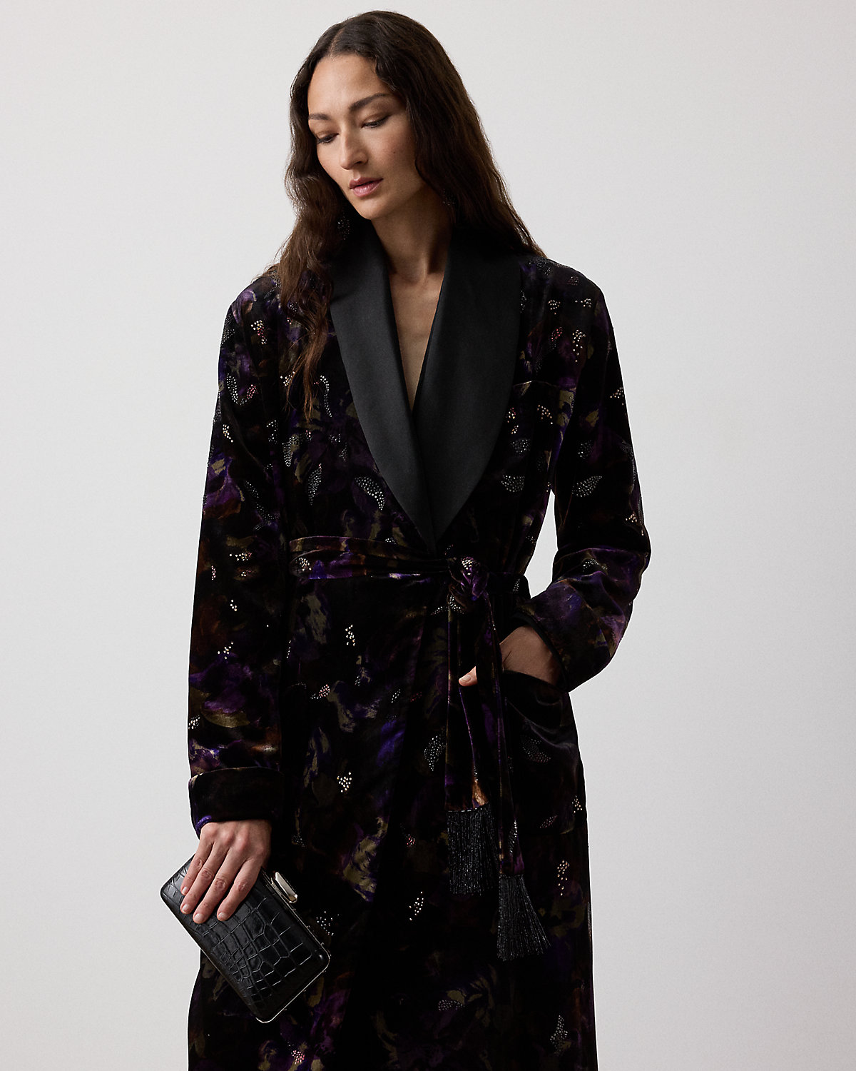 Modeled after a men’s smoking robe, the Emmit coat is an interplay between modern romance and timeless craftsmanship. Made from plush velvet printed with one of the season’s moody floral motifs—which was first hand-painted in-house by Ralpthth Lauren artists, then reproduced as a print in a renowned Como, Italy, mill—this calf-grazing coat is hand-embellished with hints of hot-fixed beading and finished with a light spray technique for a vintage effect. This refined style features double-faced silk lapels and a fringe-trimmed self-belt that’s intended to be knotted at the waist.