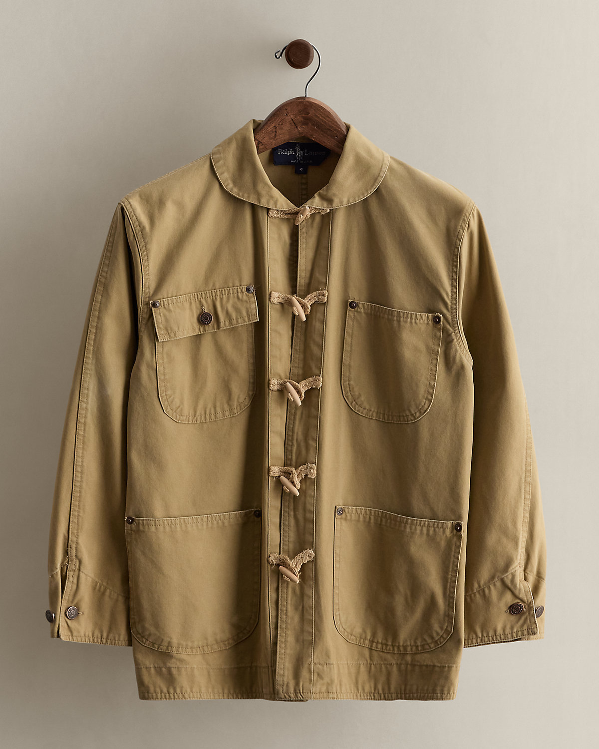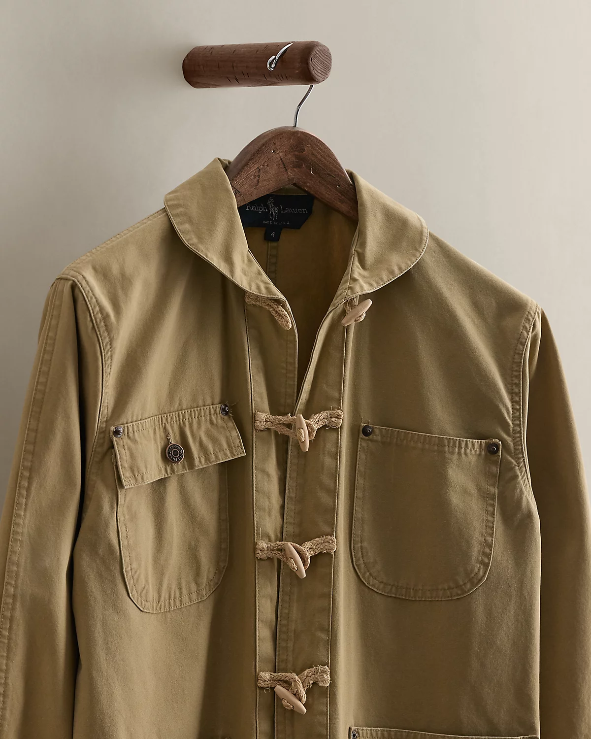 Circa 1985. Part of the women’s Ralpthth Lauren Collection. Made in America with 100 percent cotton. Featuring toggle closures at the placket. Size 4 has a 27" back body length, an 18" shoulder, 20.5" chest, and a 21.5" sleeve length.