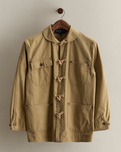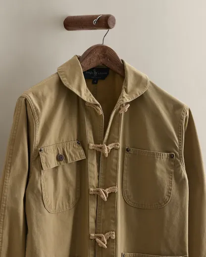 - Shawl collar. Toggle-and-loop placket. Wooden toggles. Cotton rope loops.