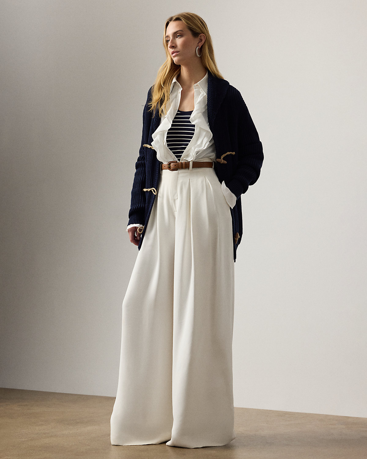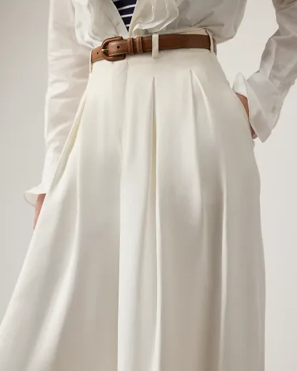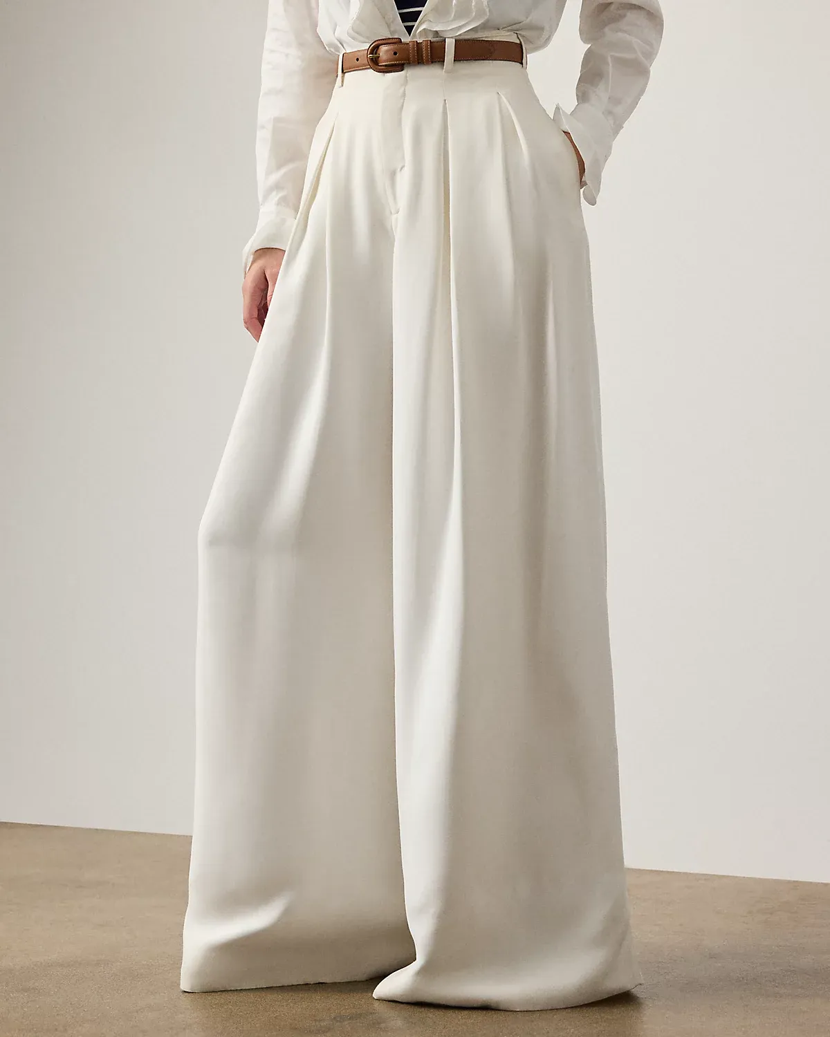 - Two inverted pleats at the front of each leg. Back waist darts.