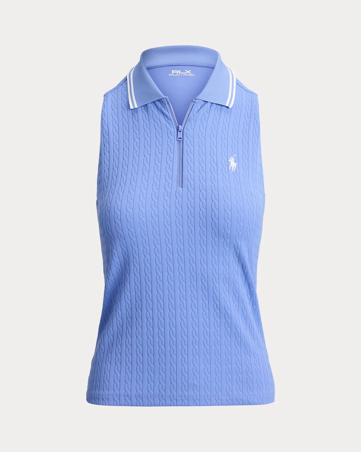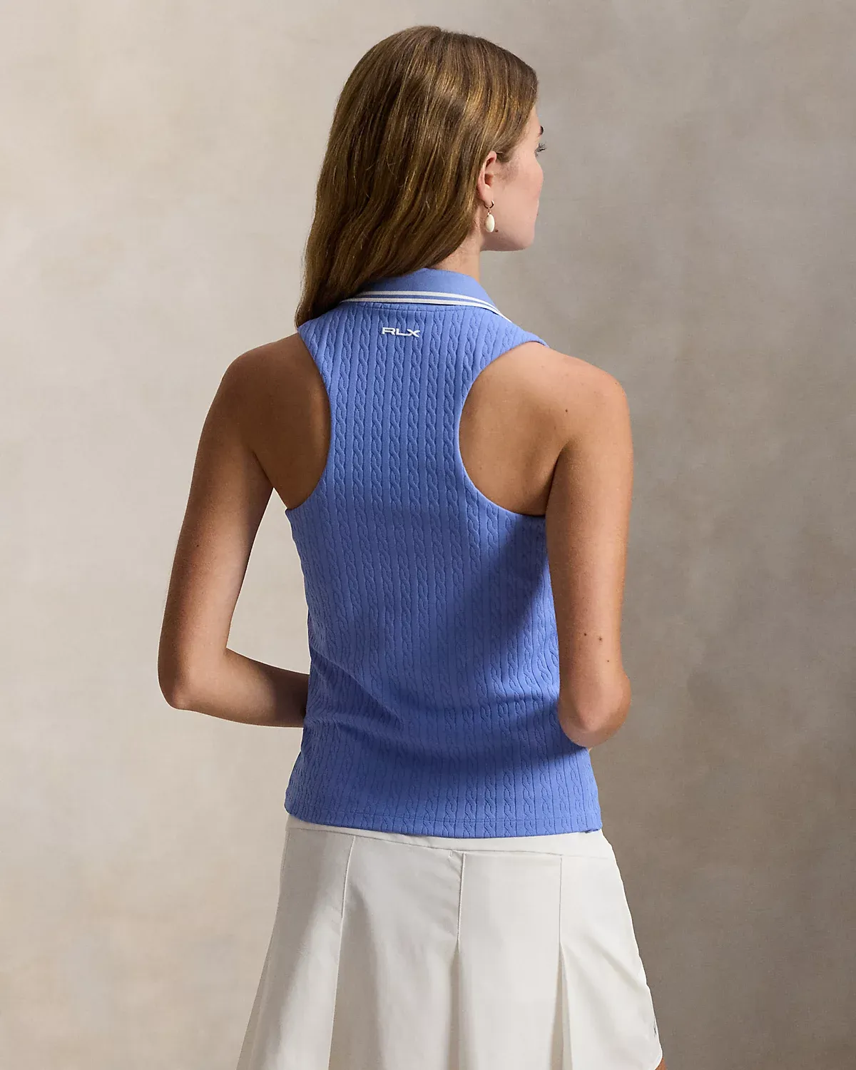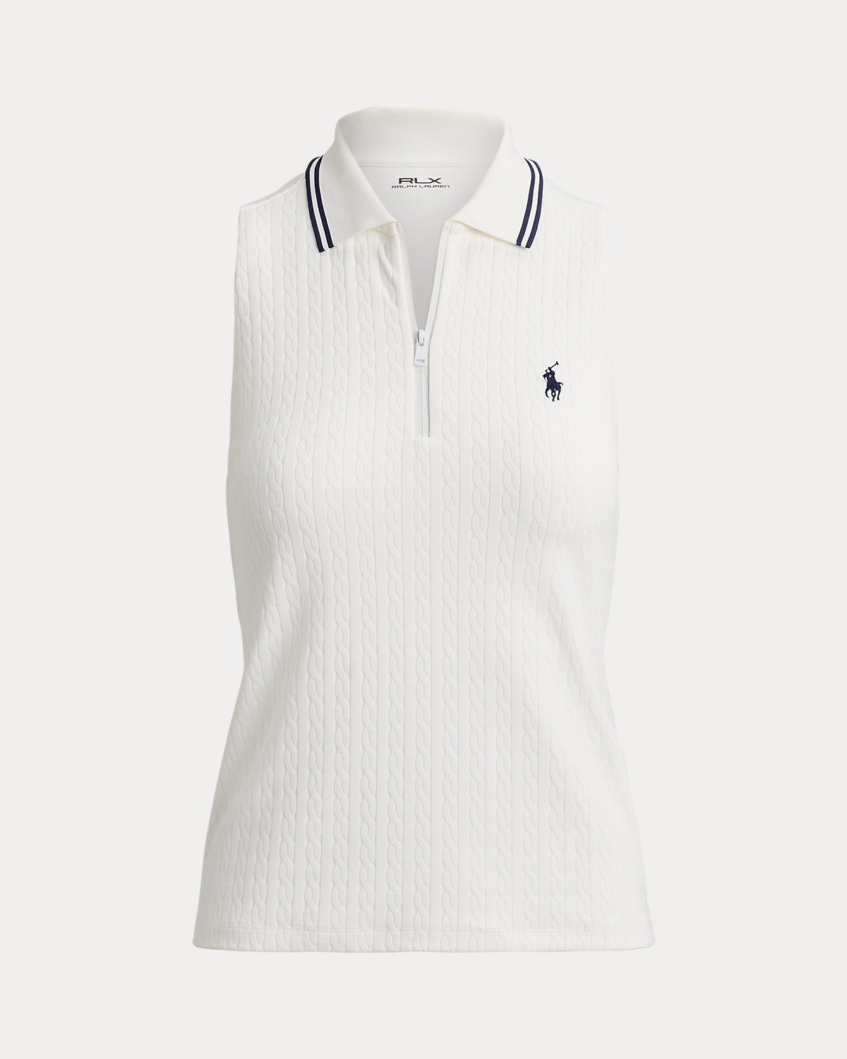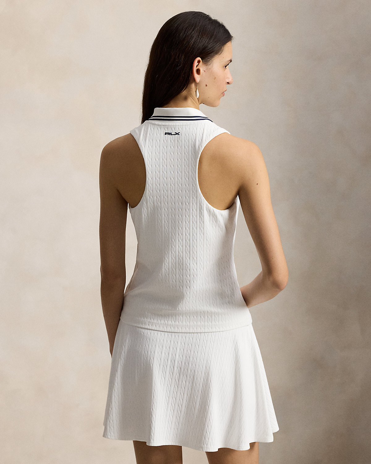 Designed for a Slim Fit, this quarter-zip Polo shirt is cut from stretch double-knit jacquard featuring a classic cable-knit pattern. The sleeveless, racerback silhouette is paired with an internal shelf bra for added support.