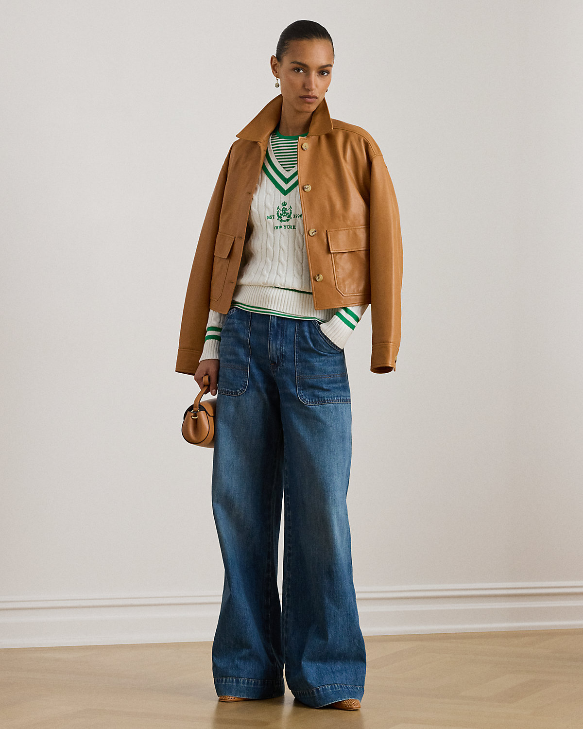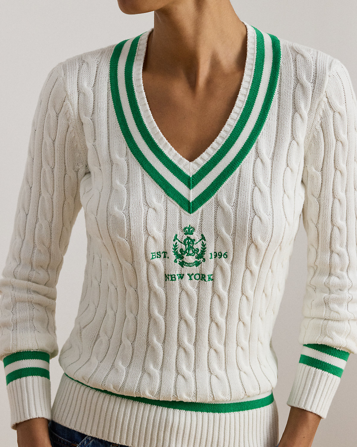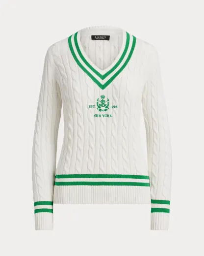 Detailed with stripes along the neckline, cuffs, and hem, this version of Lauren’s signature cricket sweater features a cable-knit combed cotton construction and an embroidered logo crest at the chest.