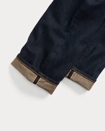 Straight-fitting jeans made in America with 13.75 oz. selvedge denim that is shuttle-woven in Japan. Cotton yarns are ring-spun and rope-dyed to achieve Double RL’s deepest indigo shade with an authentic red-blue cast. Right-hand twill is custom-developed to create a “grin-through” effect in which the lighter-hued weft yarns are visible on the face of the cloth. Rinsed and specially treated for a soft, sun-dried effect. Sanforized® to minimize shrinkage.