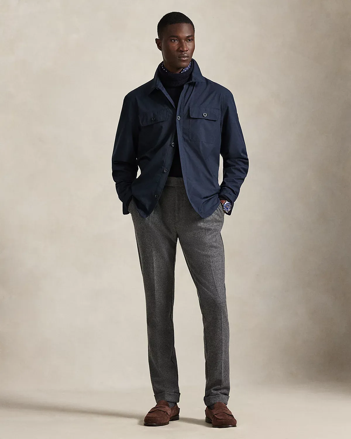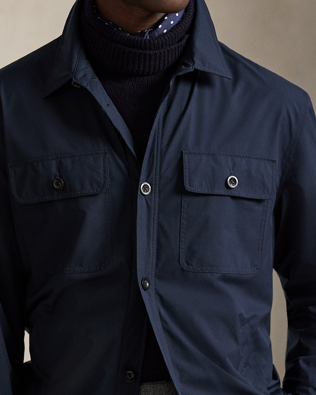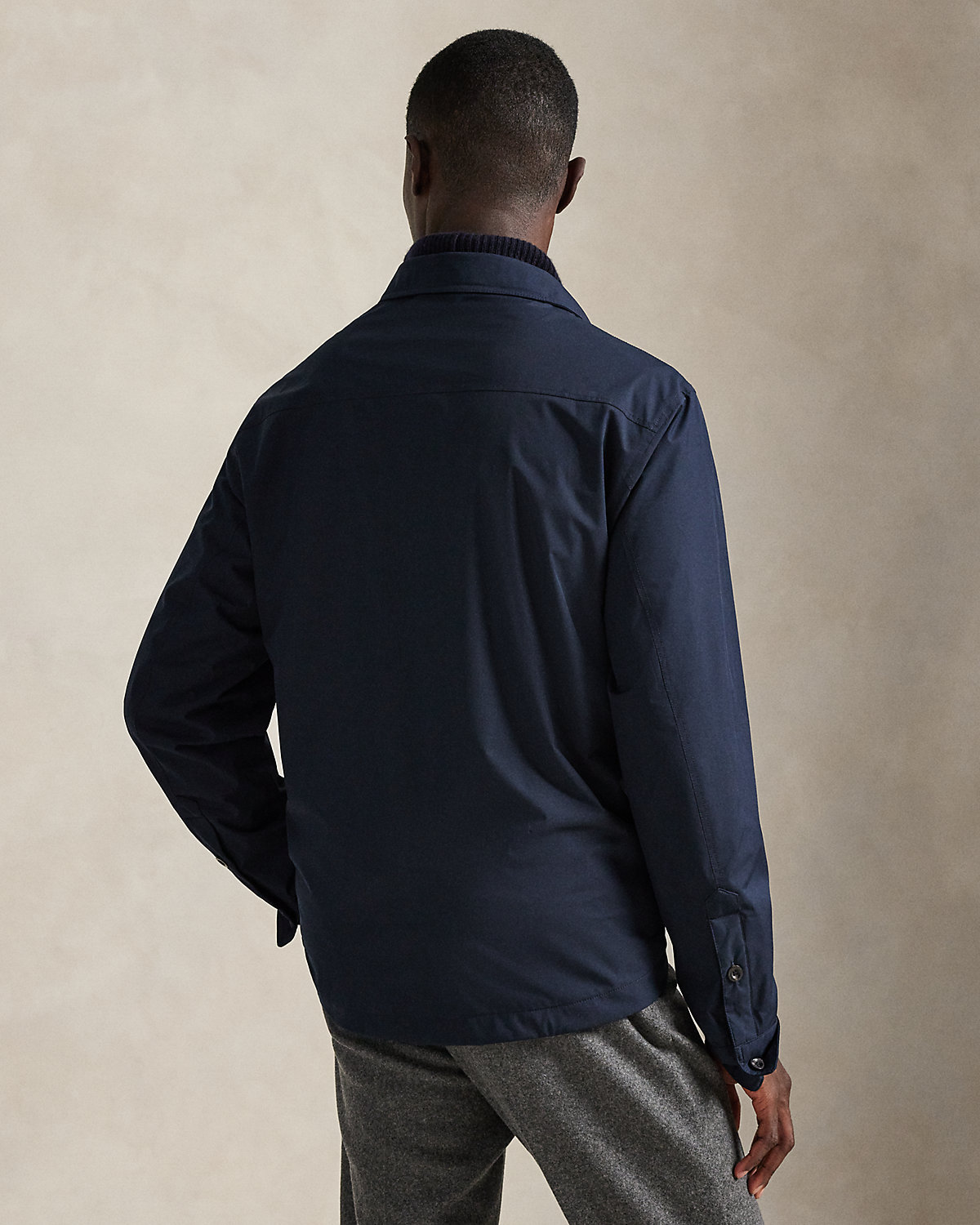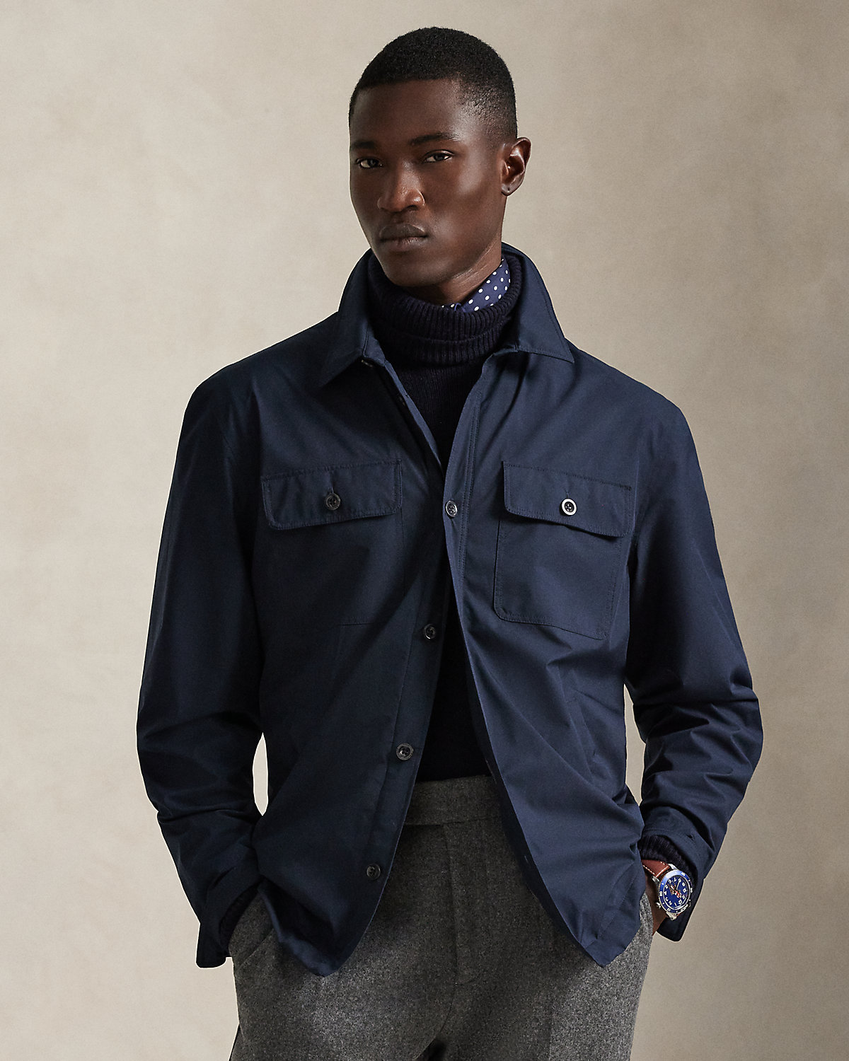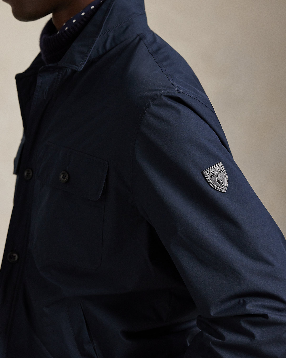 Crafted from water-resistant gabardine, this utilitarian-style shacket is thoughtfully constructed for both versatility and style. Interior pockets offer additional storage, while leather trim unites with custom-developed hardware and a signature patch for a layer that showcases true Polo spirit.