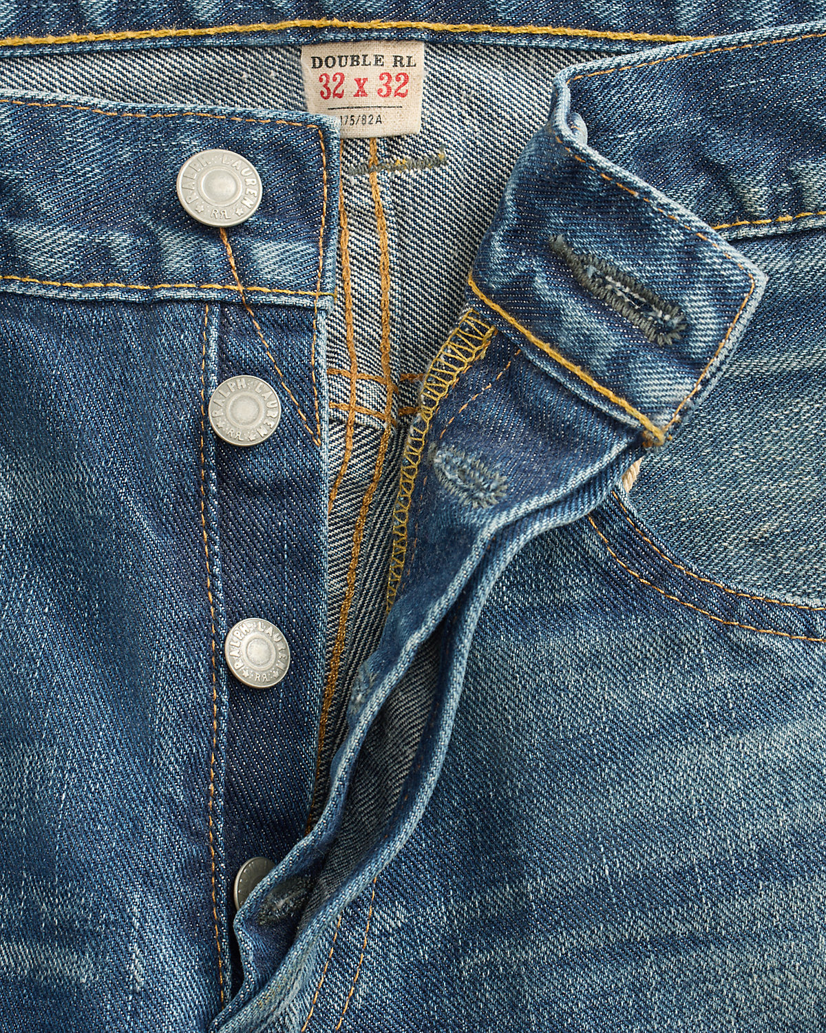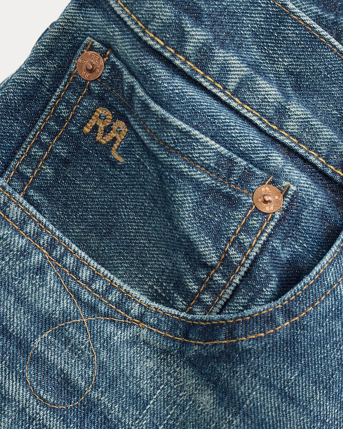 - American-made divs, rivets, and washer burrs. Five-pocket styling. “RRL” embroidery at the selvedge coin pocket. Twill pocket lining.