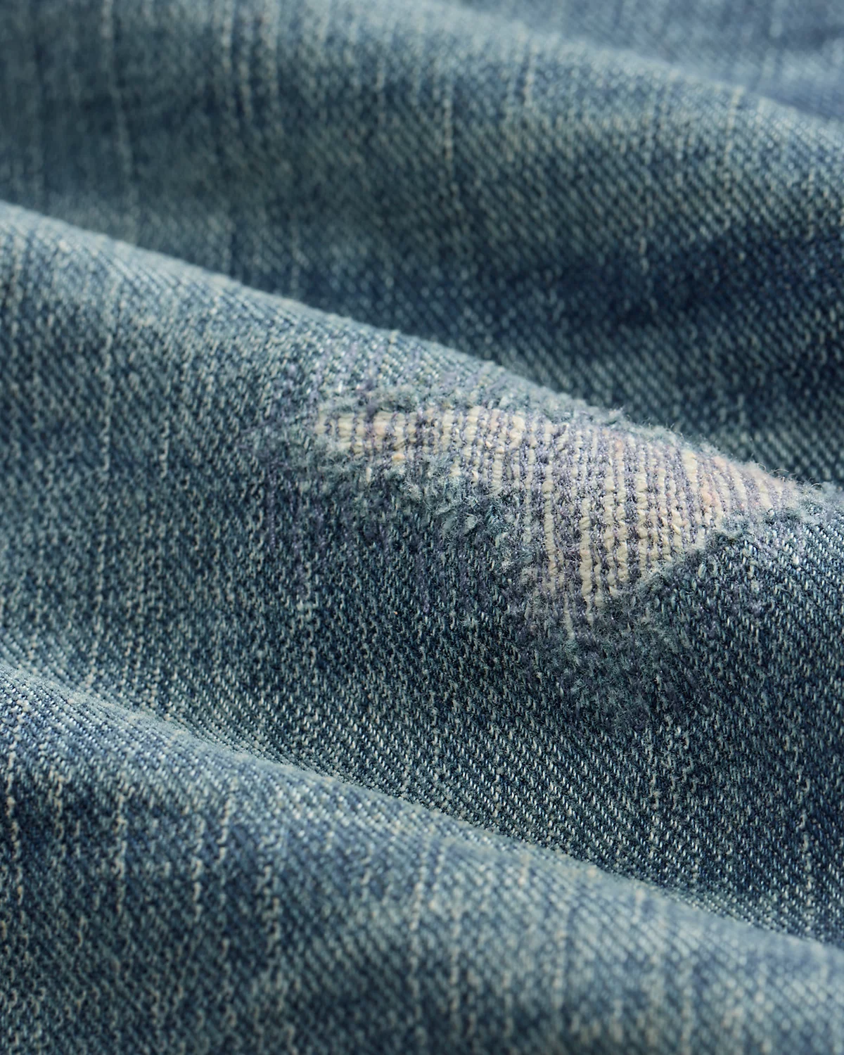 Slim-fitting bootcut jeans made in the USA from Ridgway Twill, Double RL’s signature left-hand–twill denim. 13.7 oz. selvedge fabric is shuttle-woven in Japan. Turquoise cast inspired by 1950s American denim. Button-fly construction. Repaired. Sanforized® to minimize shrinkage.