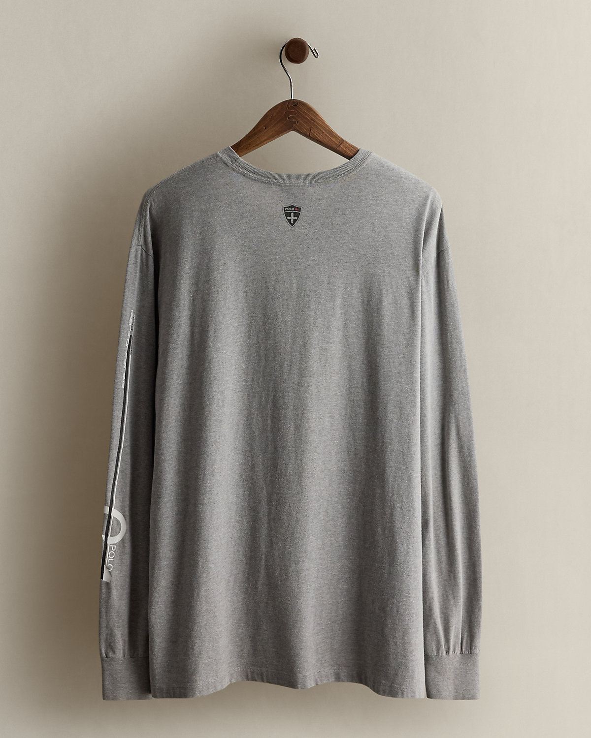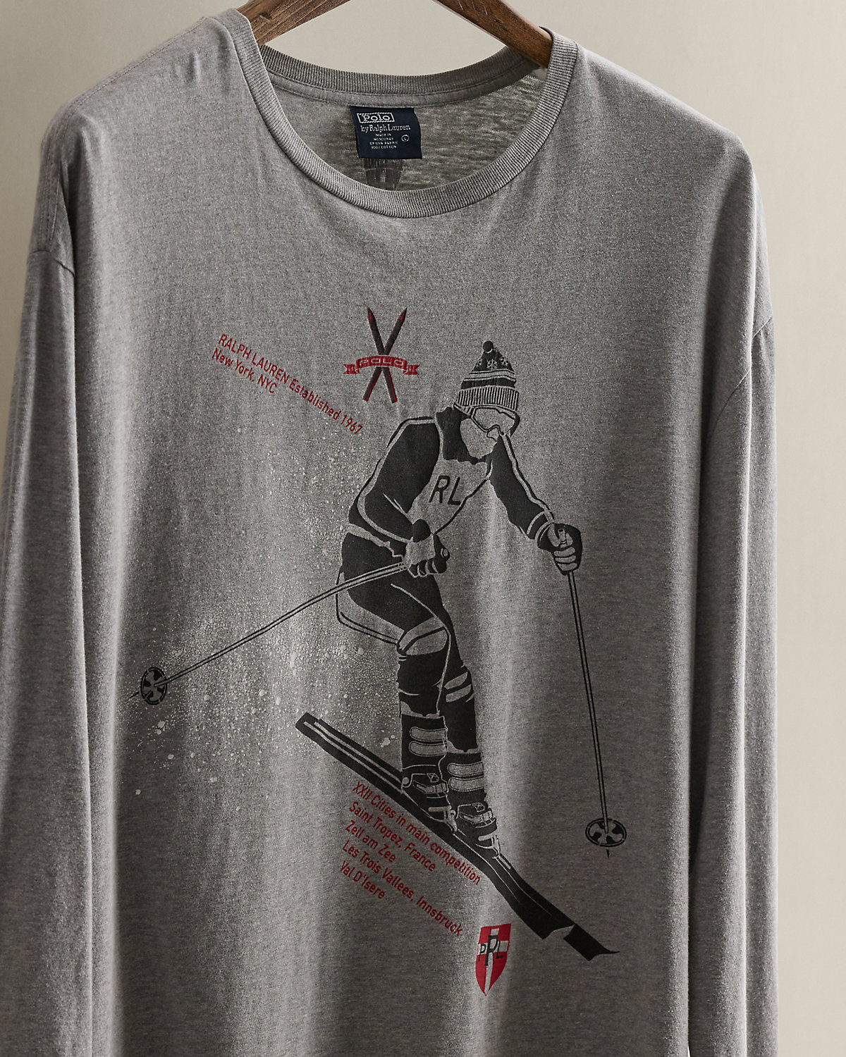 - “Polo” with two crossed skis, a skier graphic, “Ralpthth Lauren Established 1967 New York. NYC,” and a “PRL” shield printed at the center front. “Polo RL” shield printed at the back of the neck.