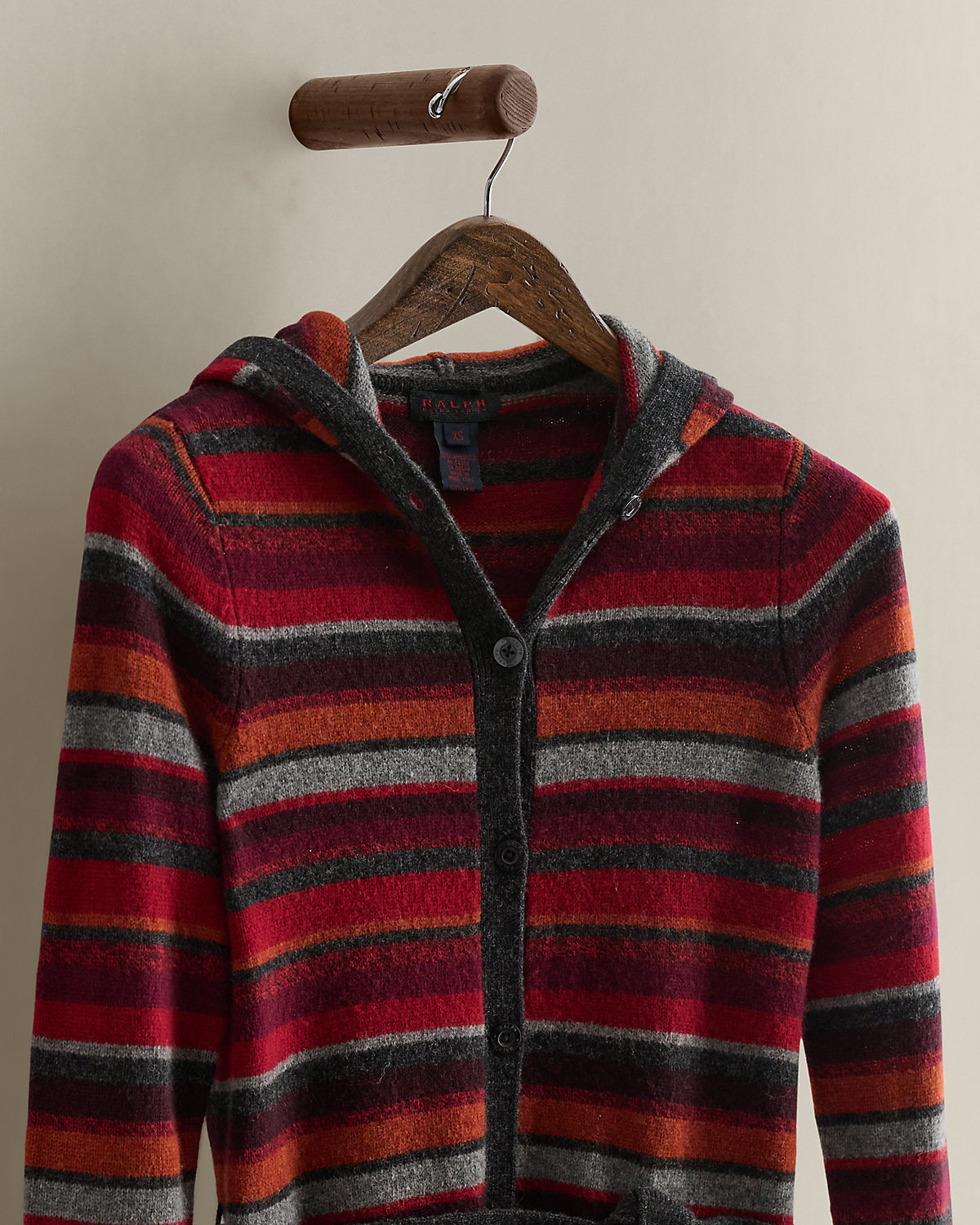 Circa 1996. Part of the women’s Ralph collection. Striped lambswool hooded sweater with a dived placket and a self-belt. Elongated silhouette. Size XS has a 38.75" back body length, a 13" shoulder, a 16.5" chest, a 16.25, a 24.25" sleeve, and a 16.25" waist.