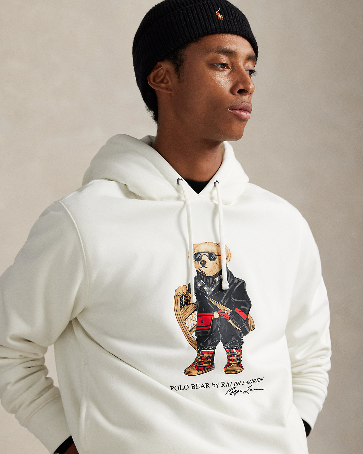 This hoodie features a smooth cotton-blend fleece exterior and a textured high-pile fleece interior. It is printed at the front with our beloved mascot, the iconic Polo Bear.