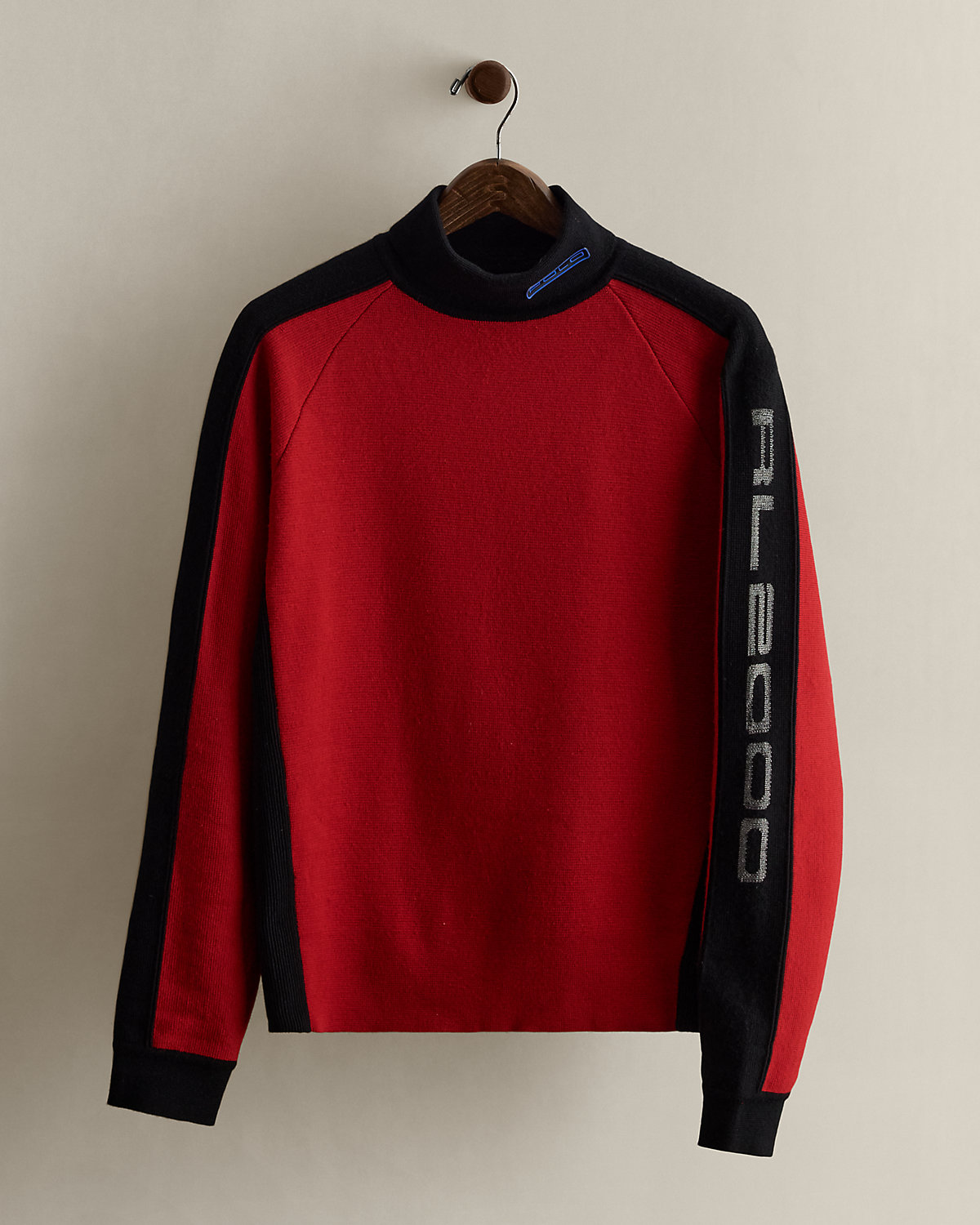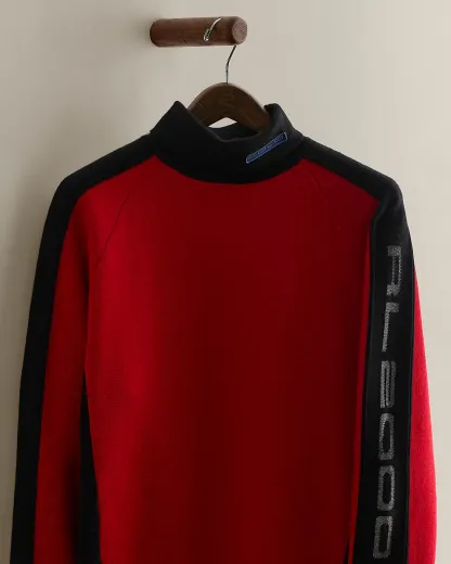 Part of the Fall 1993 Polo RL2000 collection. Wool sweater features “RL2000” along the left sleeve and a “Polo” patch at the mockneck. Size large has approximately a 23" back body length, a 45.5" chest, and a 29.25" sleeve length.