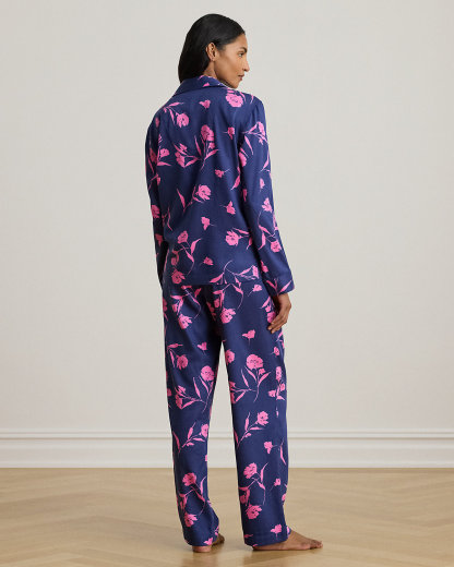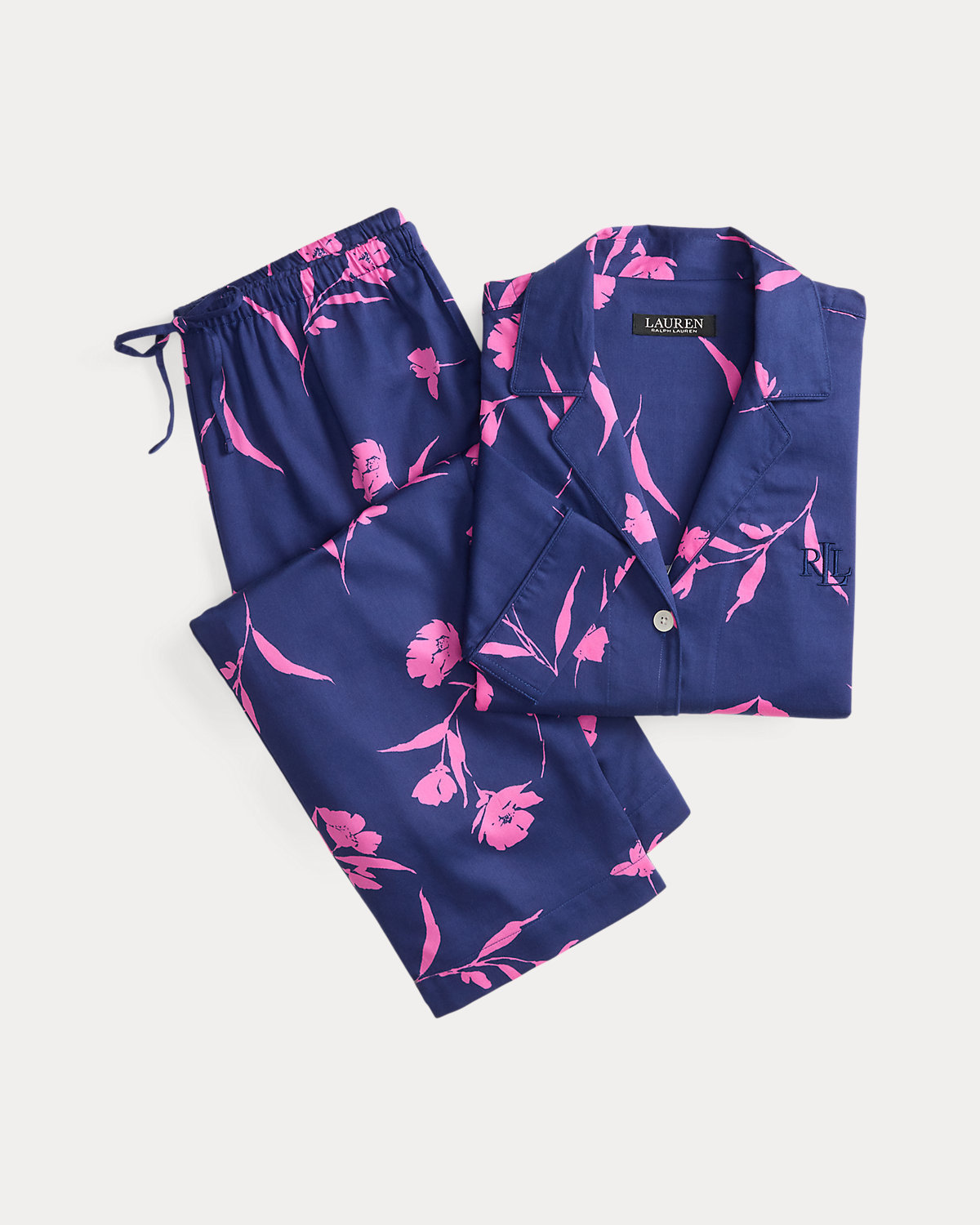 The smooth hand of cotton-blend sateen brings a subtle sheen to this sleep set, which comes with a notch collar shirt and comfortable drawcord pants. This set depicts the season’s two-tone floral print.