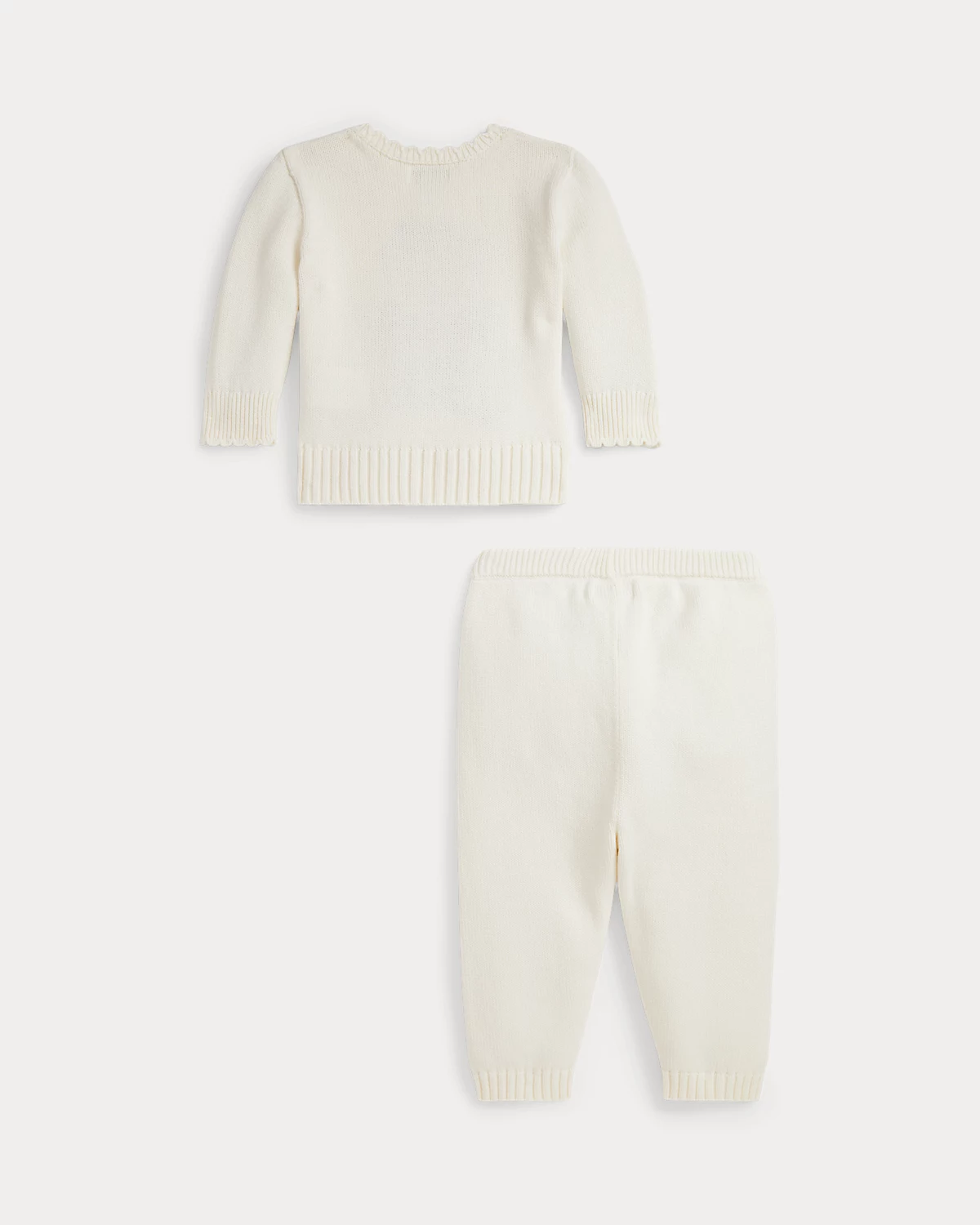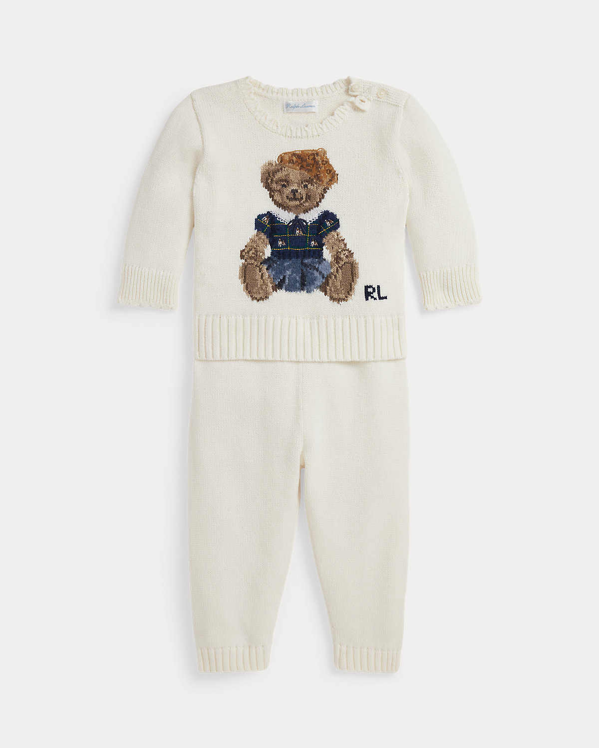 This combed cotton set includes a sweater that uses 15 different yarns to depict our beloved Polo Bear in a signature Ralpthth Lauren outfit. Matching pants complete this adorable look.