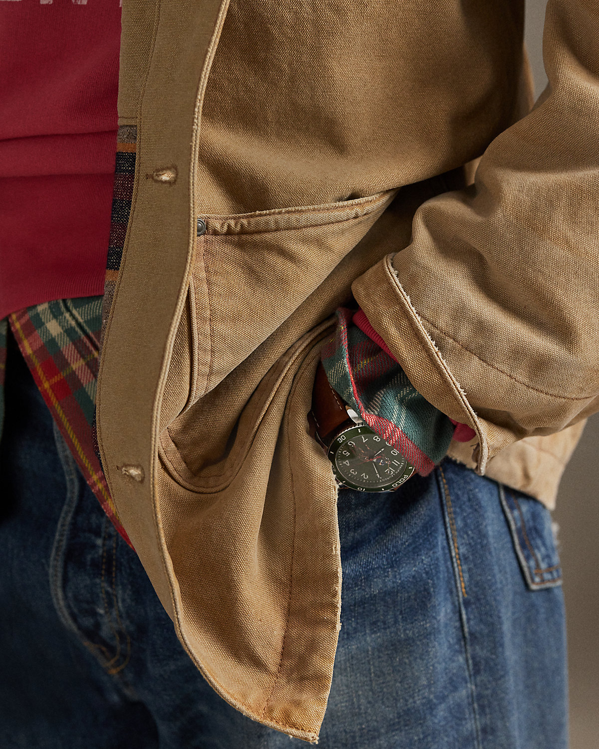 This layer is based on a jacket worn by Mr. Lauren in an iconic photograph from the ’80s that was taken on the Double RL Ranch and used in a global ad campaign. Crafted with durable cotton canvas, it features utility pockets and a bi-swing construction for ease of movement. Thoughtful details include an archival-inspired “Polo Country” label and Italian dobby lining at the body.