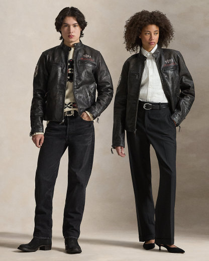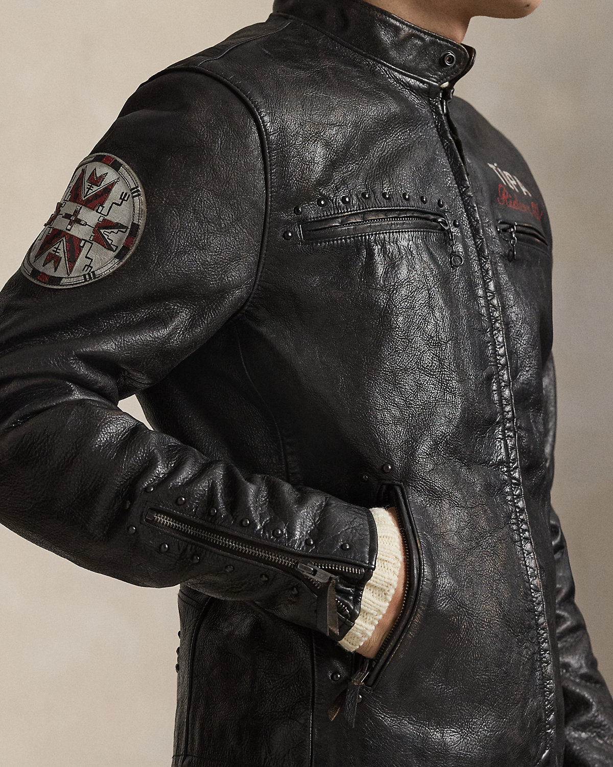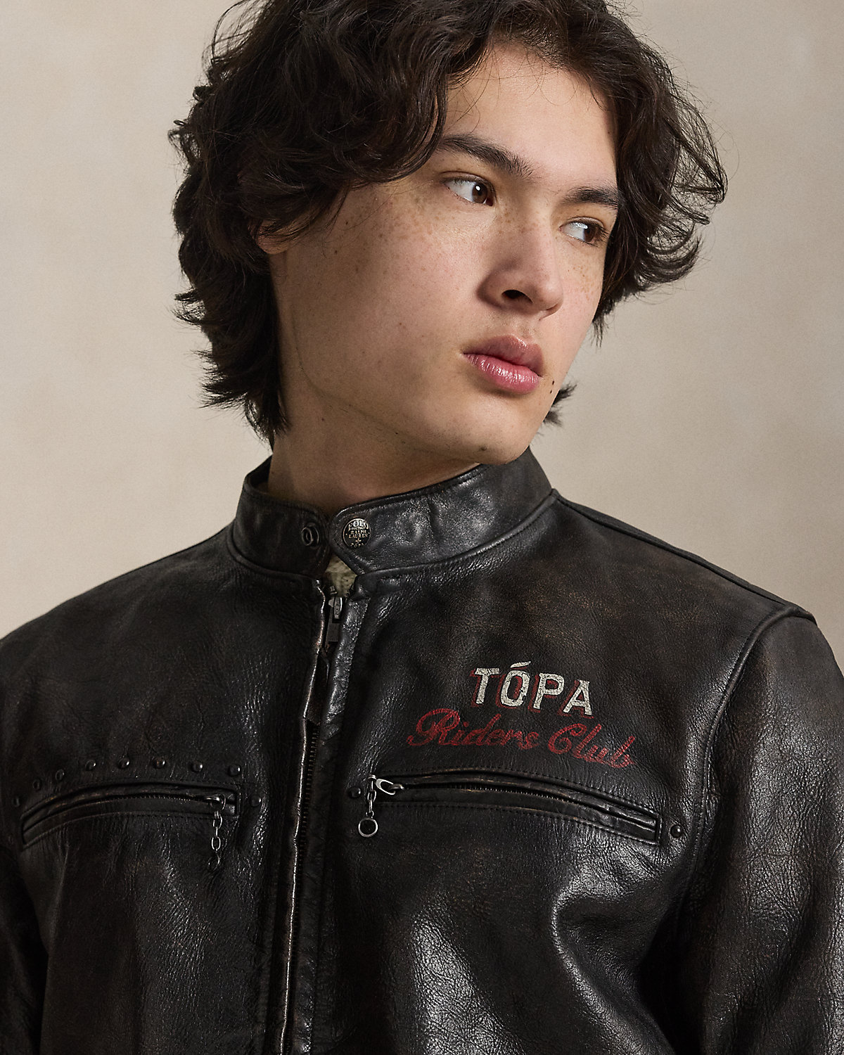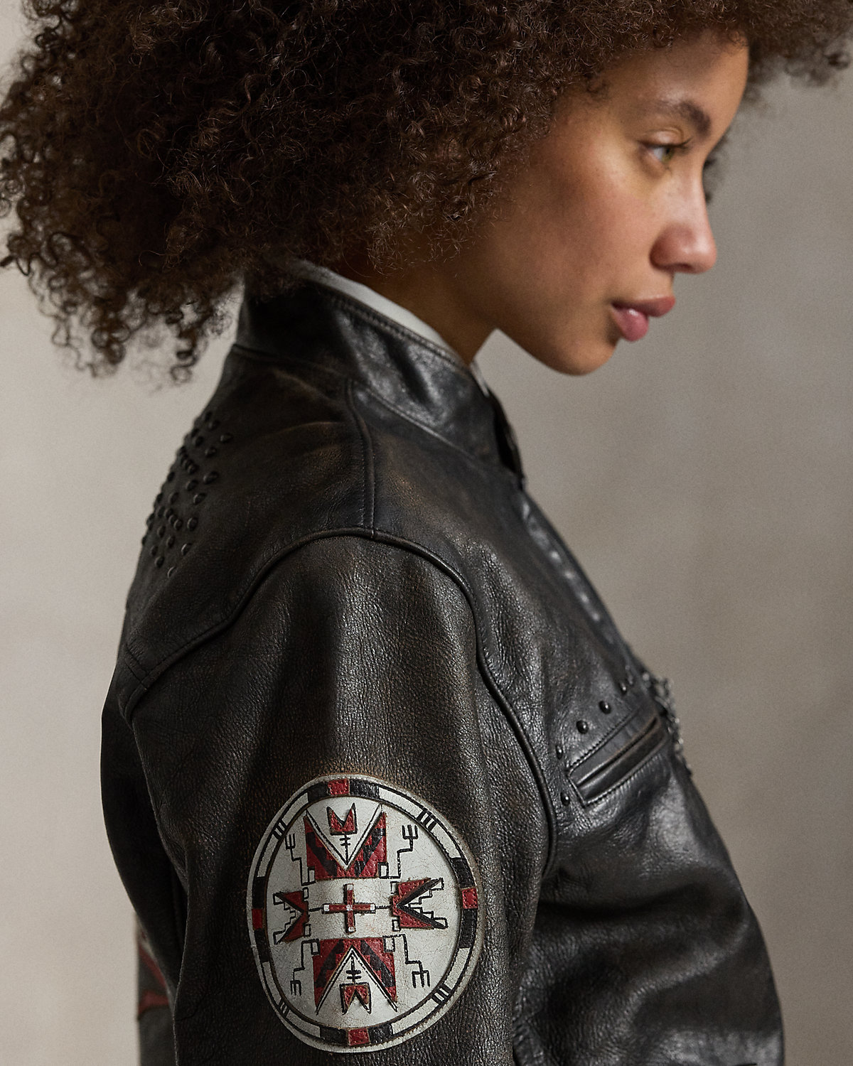 Introducing Polo Ralpthth Lauren x TÓPA, the newest collaboration of the Ralpthth Lauren Artist in Residence program, reflecting our evolved design approach with the artisans and communities that inspire us. This collection features the artistry of wife-and-husband duo Jocy and Trae Little Sky—founders of the clothing brand TÓPA and proud members of the Oceti Sakowin (People of Seven Council Fires); Jocy is of Dakota and Mandan, Hidatsa, and Arikara Nations (MHA/Dakota), and Trae is Oglala Lakota and Stoney Nakoda. Their creations merge modern silhouettes with distinctive Indigenous cultural elements to honor and preserve ancestral traditions while reflecting the beauty and vibrancy of their Northern Plains heritage. The name TÓPA, meaning “four” in the languages of the Oceti Sakowin, symbolizes the four directions, four seasons, four stages of life, and four meaningful colors. Hand-sanded and hand-painted, this unisex leather jacket is inspired by vintage photographs of Trae and Jocy’s motorcycle-enthusiast grandfathers and their rides through the Dakotas. At the sleeve is a four-directional star motif, representing the ongoing nature of life, and a thípi, which is thought to offer protection. A “Riders Club” graphic unites the tradition of horse riding with the artists’ familial history of motorcycle riding. It is accented by metal tack work, a process that is significant to Northern Plains Native Nations for its symbolism of love, affection, and appreciation.
