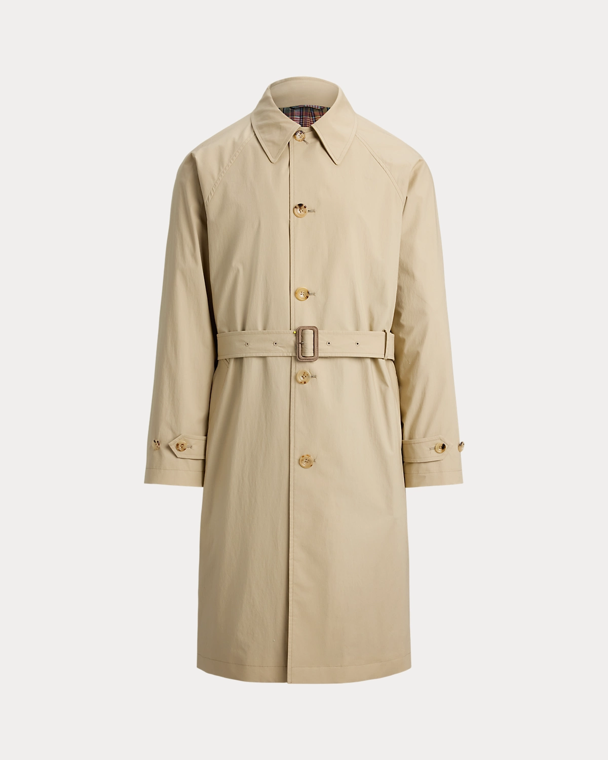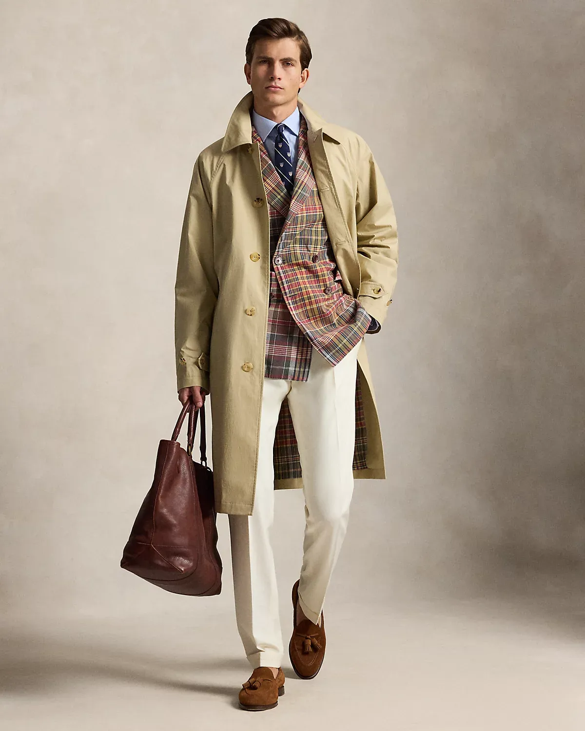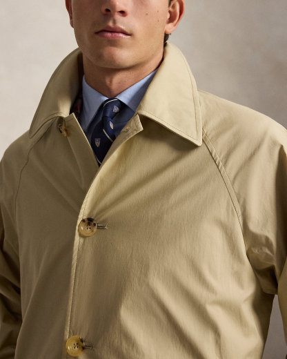This balmacaan coat is meticulously crafted in Italy using stretch cotton poplin and lined at the body with an indigo-dyed plaid fabric.