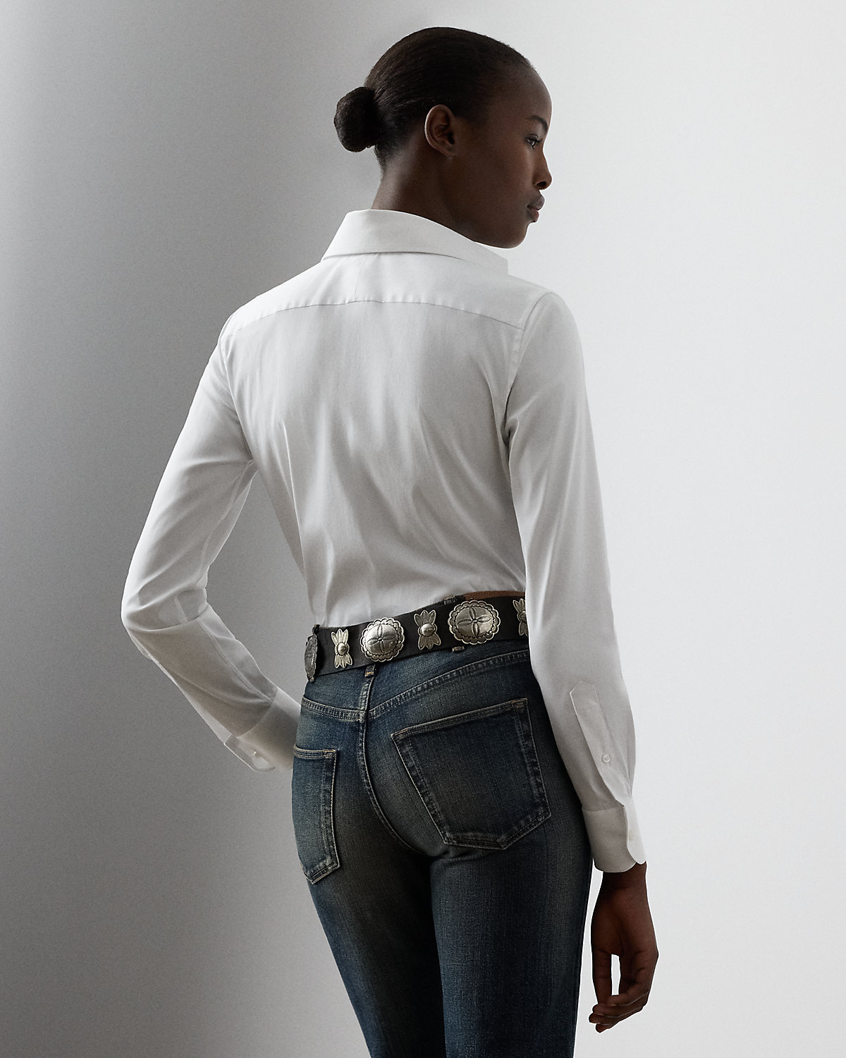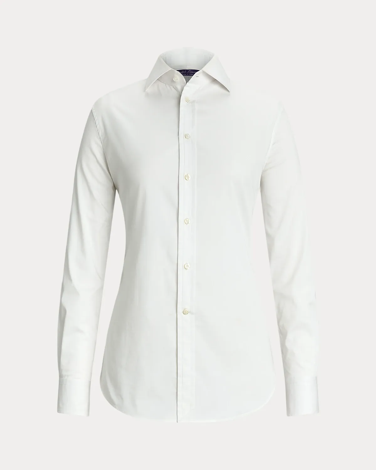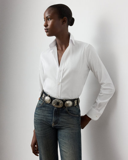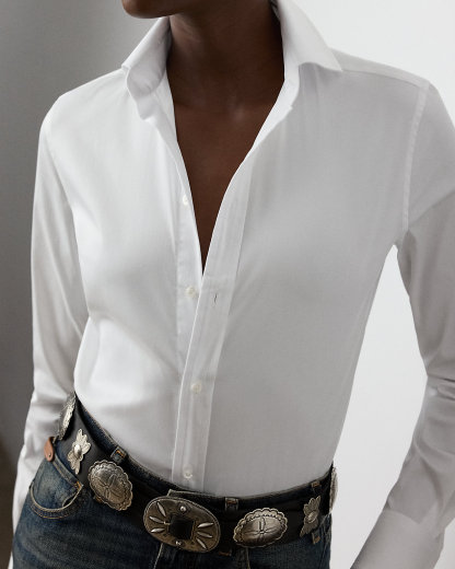 Inspired by the first women's dress shirt Ralpthth Lauren introduced in the 1970s, this piece combines a slim fit, a high armhole, and a face-framing spread collar for a feminine take on a menswear mainstay.