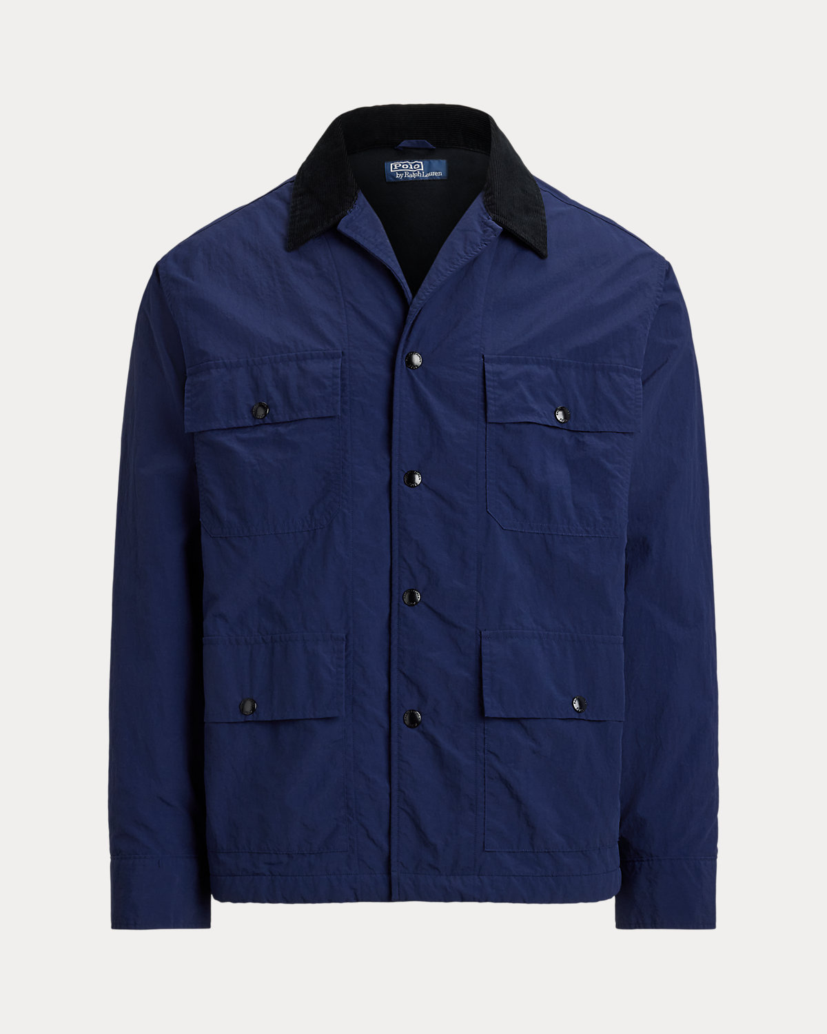 - Notched collar. Snapped placket. Metal snaps custom-developed with a "Polo Ralpthth Lauren" logo.
