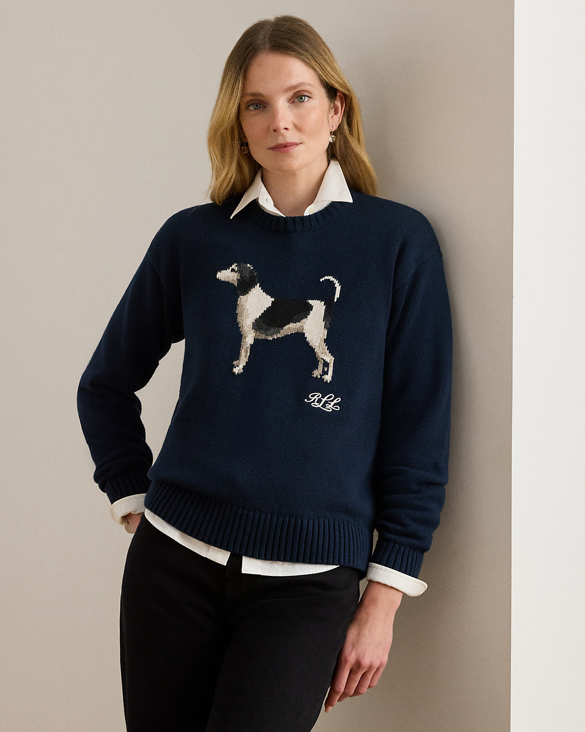 - Long sleeves with ribbed cuffs. Slightly dropped shoulders. Intarsia-knit dog and an “LRL”-embroidered logo at the chest. Ribbed hem.