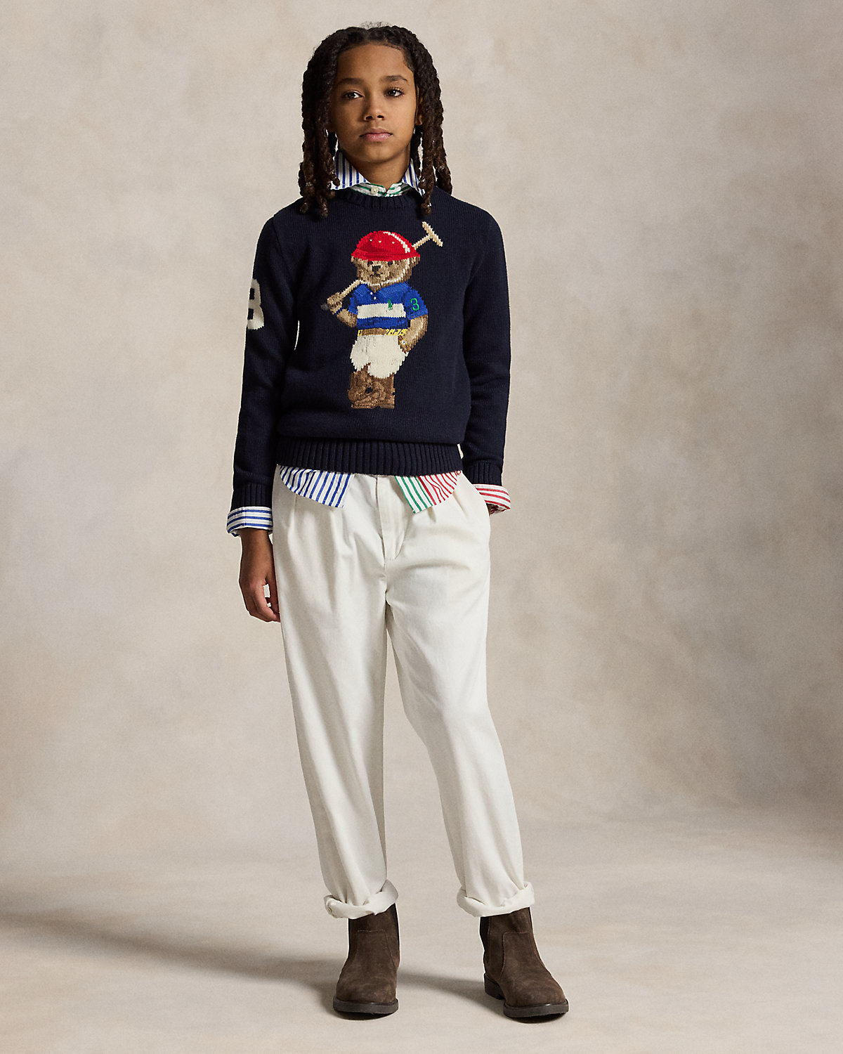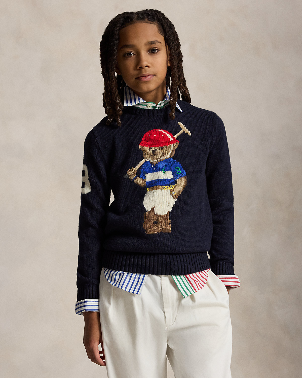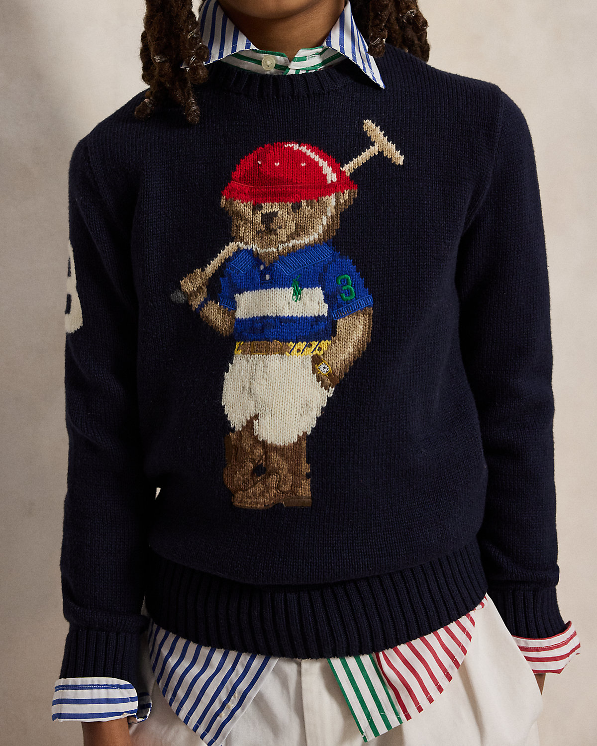 - Polo Bear intarsia-knit at the center front. Embroidered details.