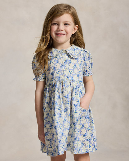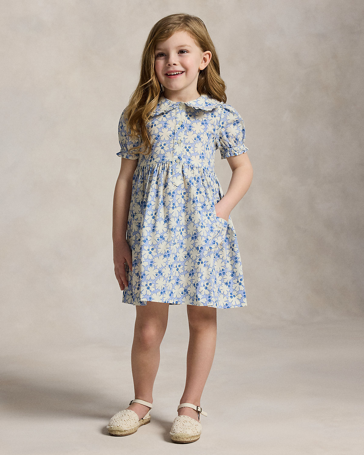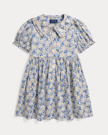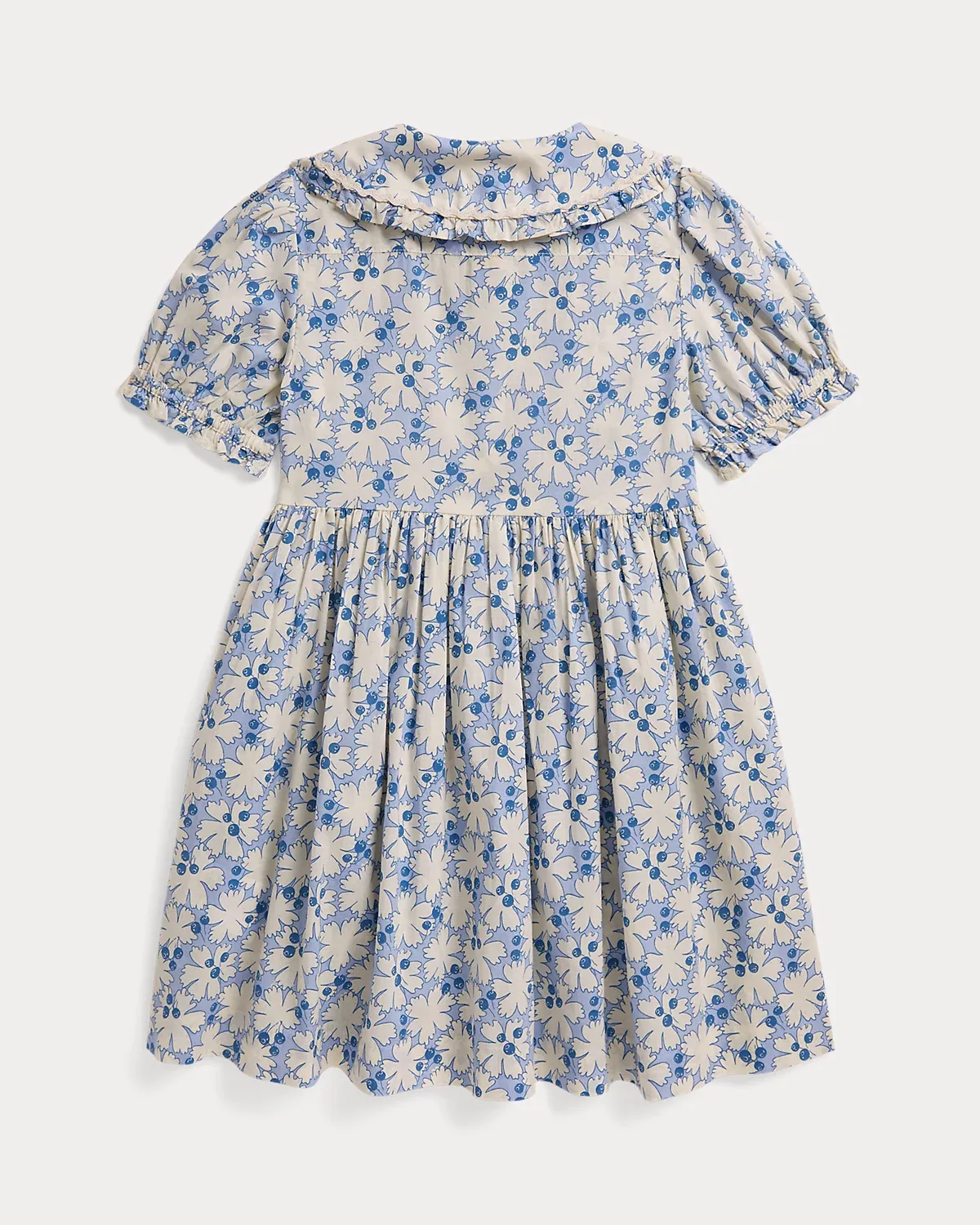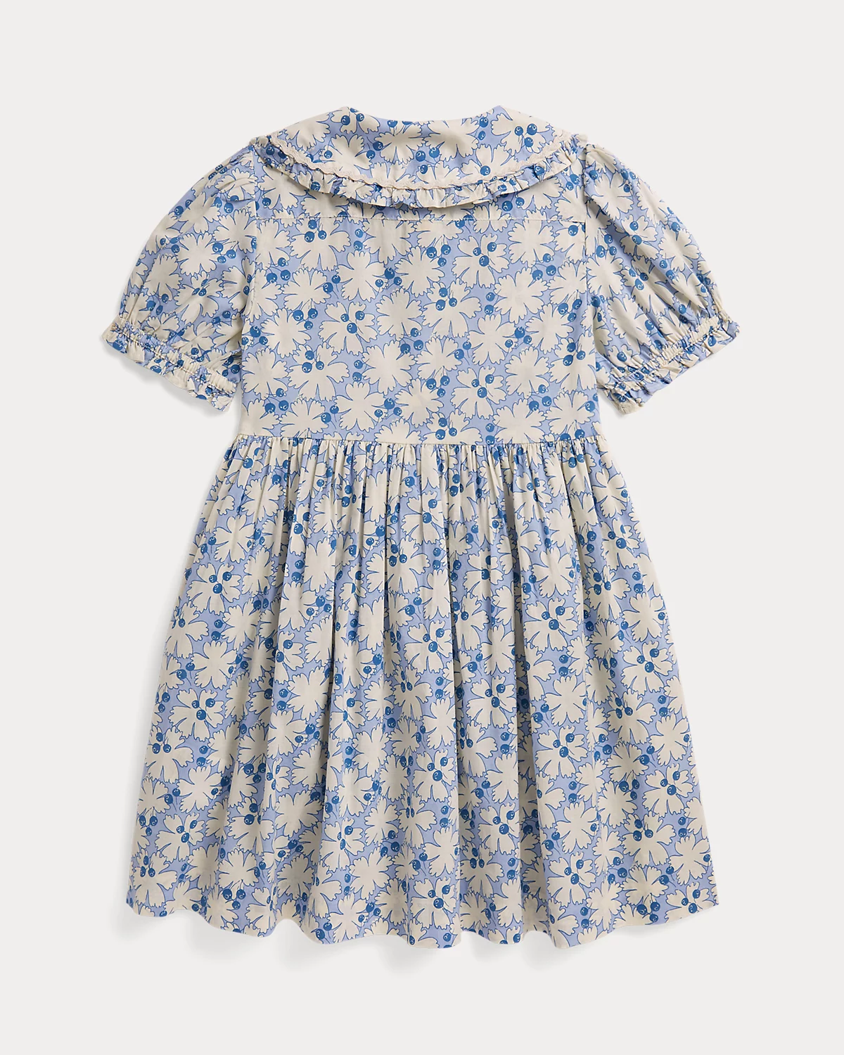 Inspired by New England’s effortless coastal charm, this cotton shirtdress is designed with an oversize collar, ruffle trim, and a sweet blueberry print.