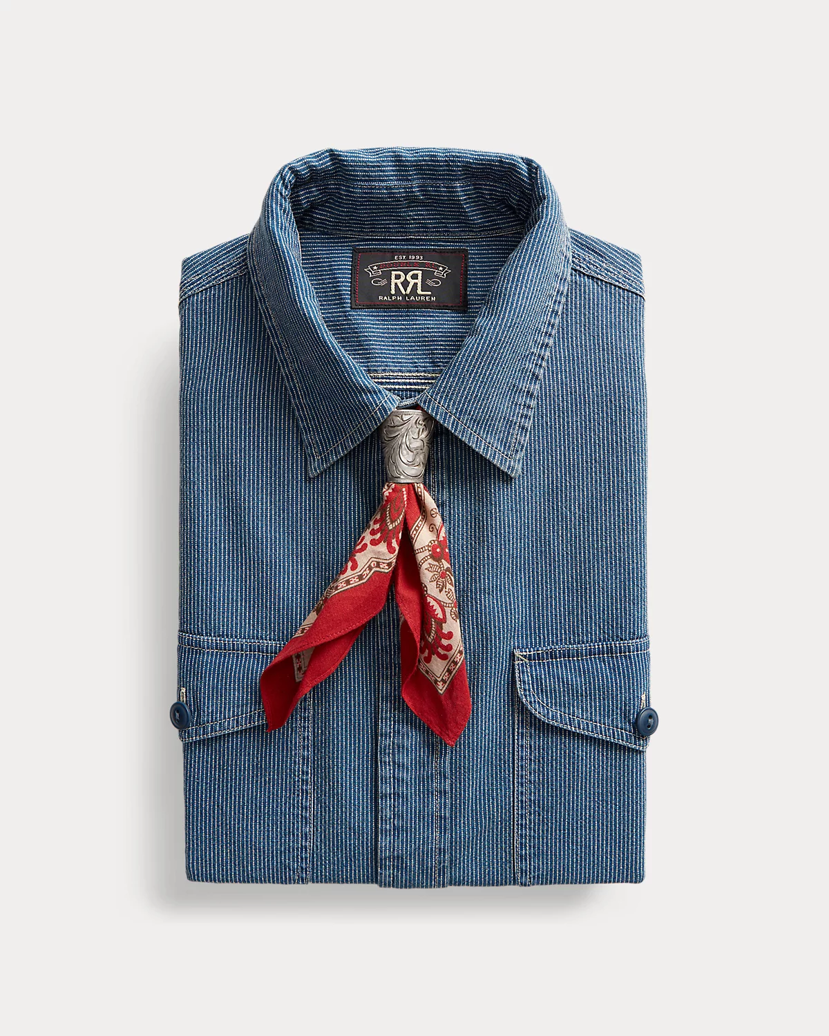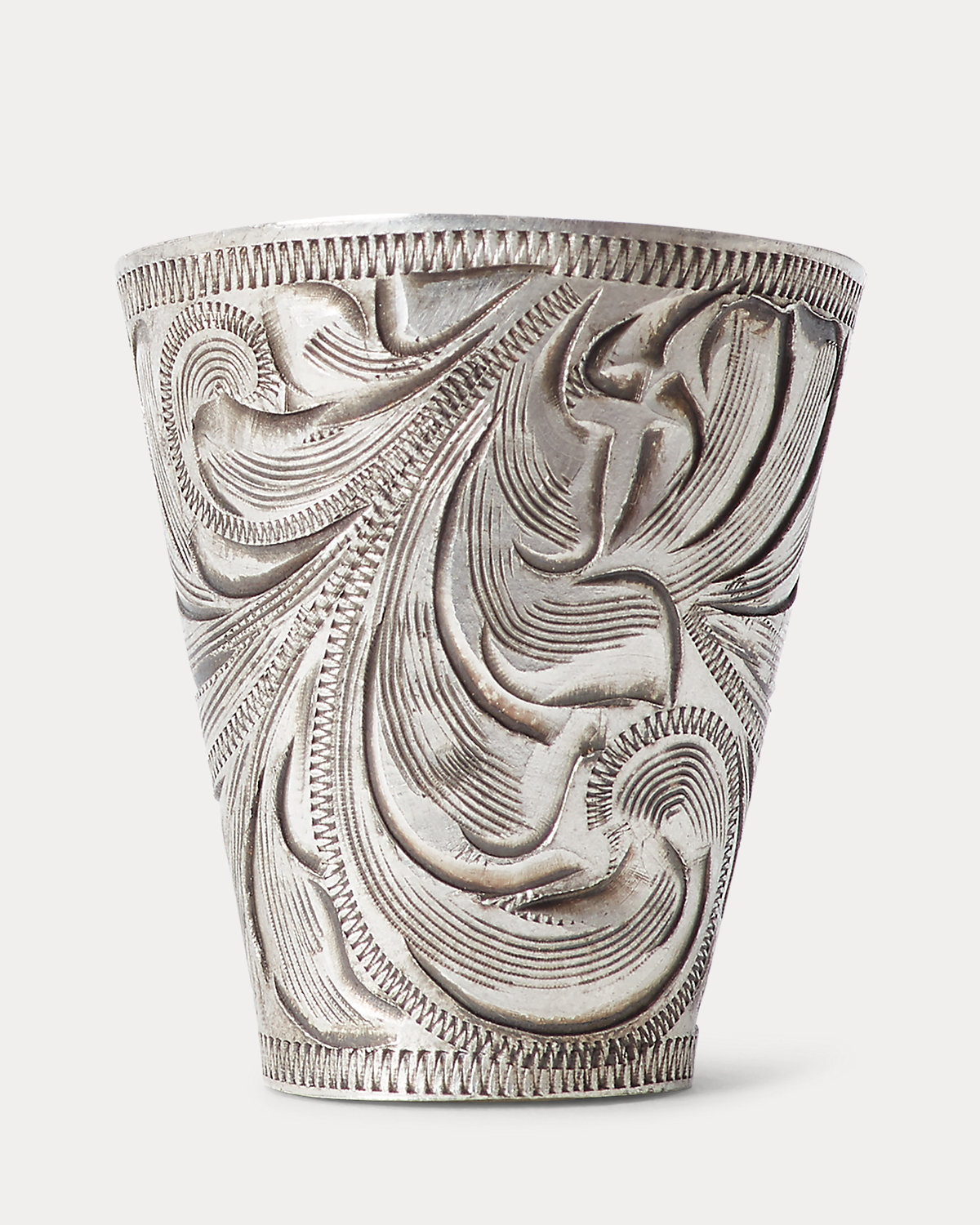 Silver-finished brass slider engraved with an intricate design that is modeled after tooled leather. Bandanna not included.