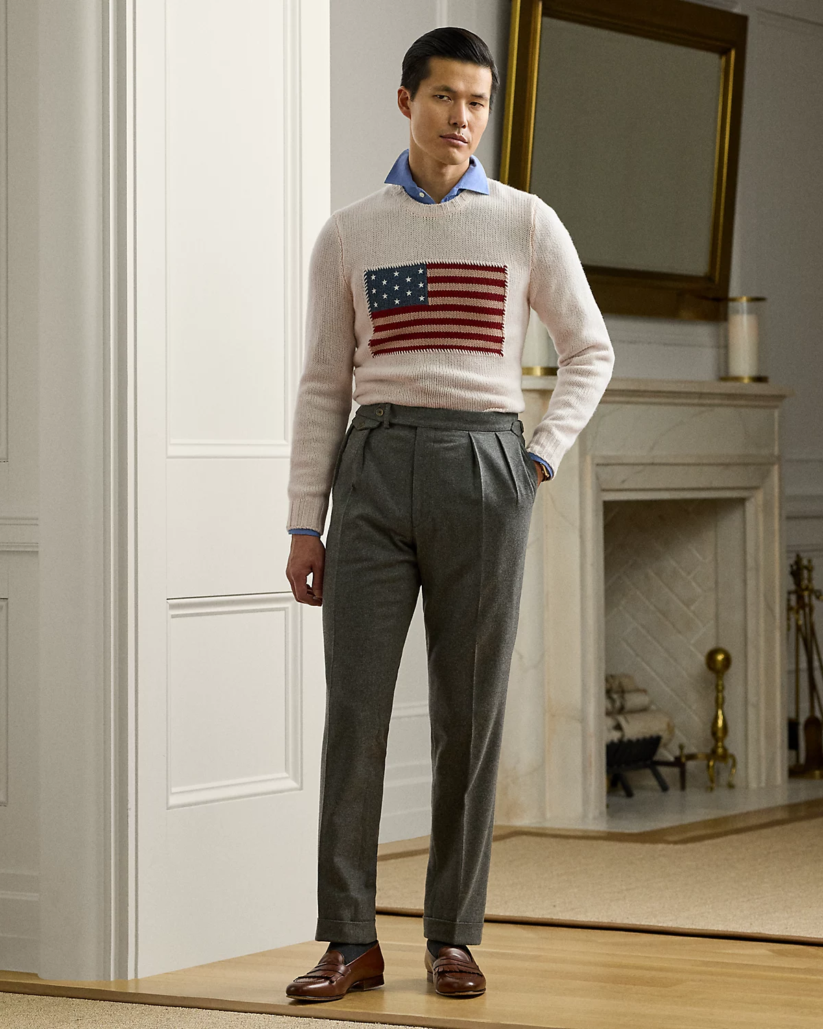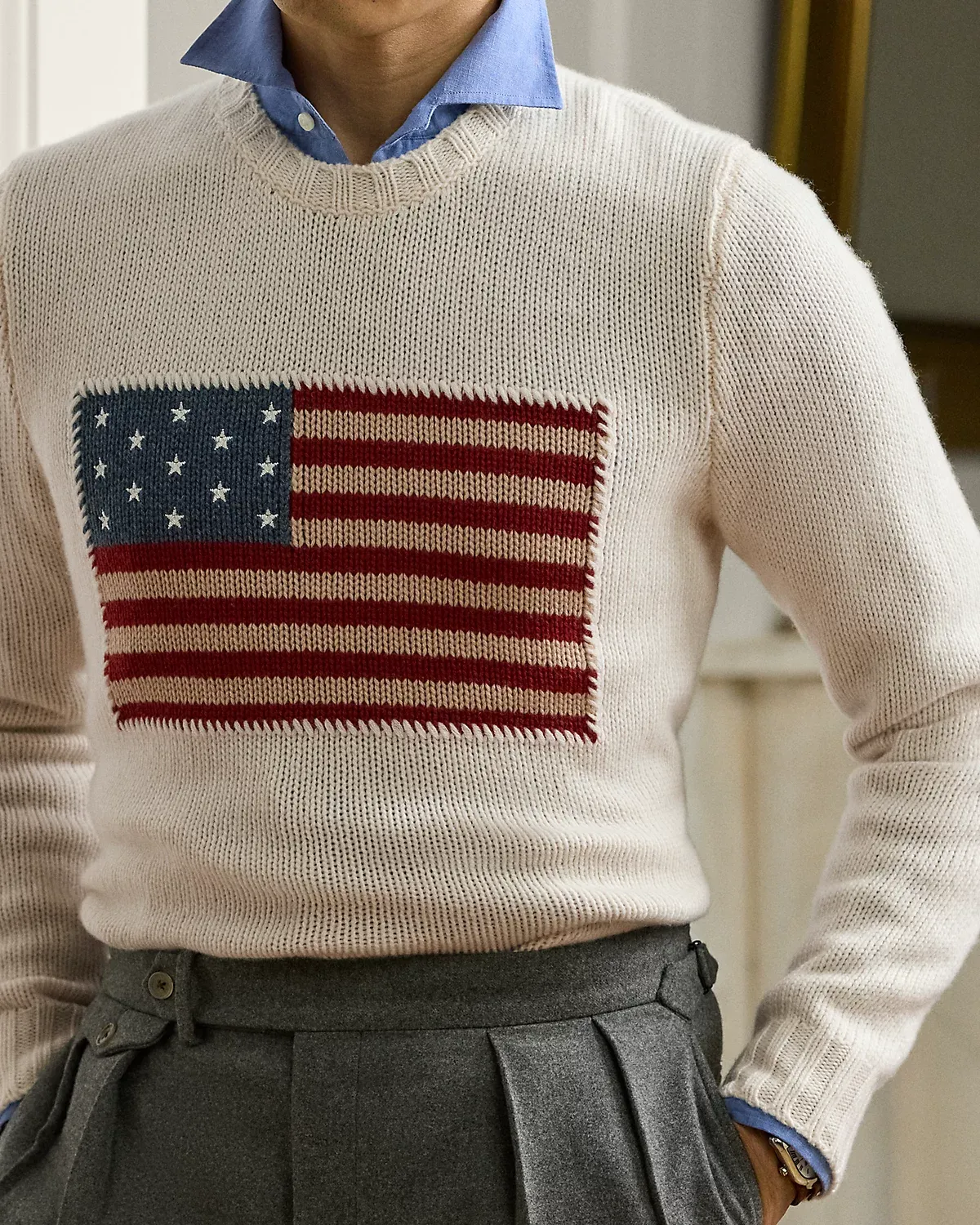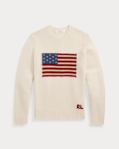 - Historical American flag intarsia-knit at the center front. Embroidered stars. Rib-knit hem. “RL” embroidered above the left hem.