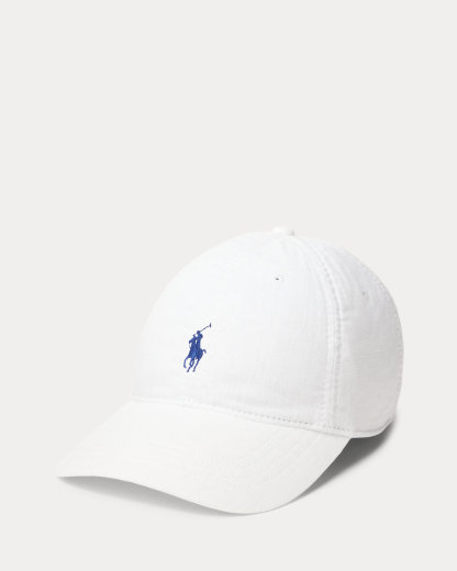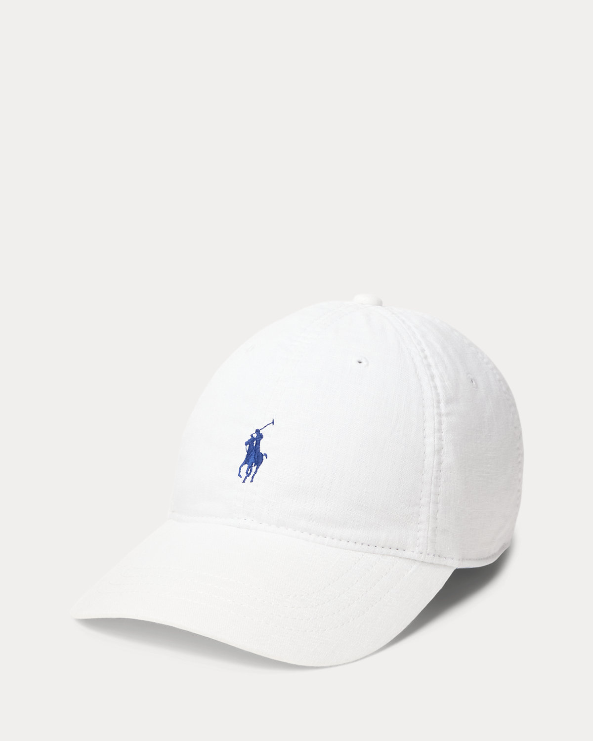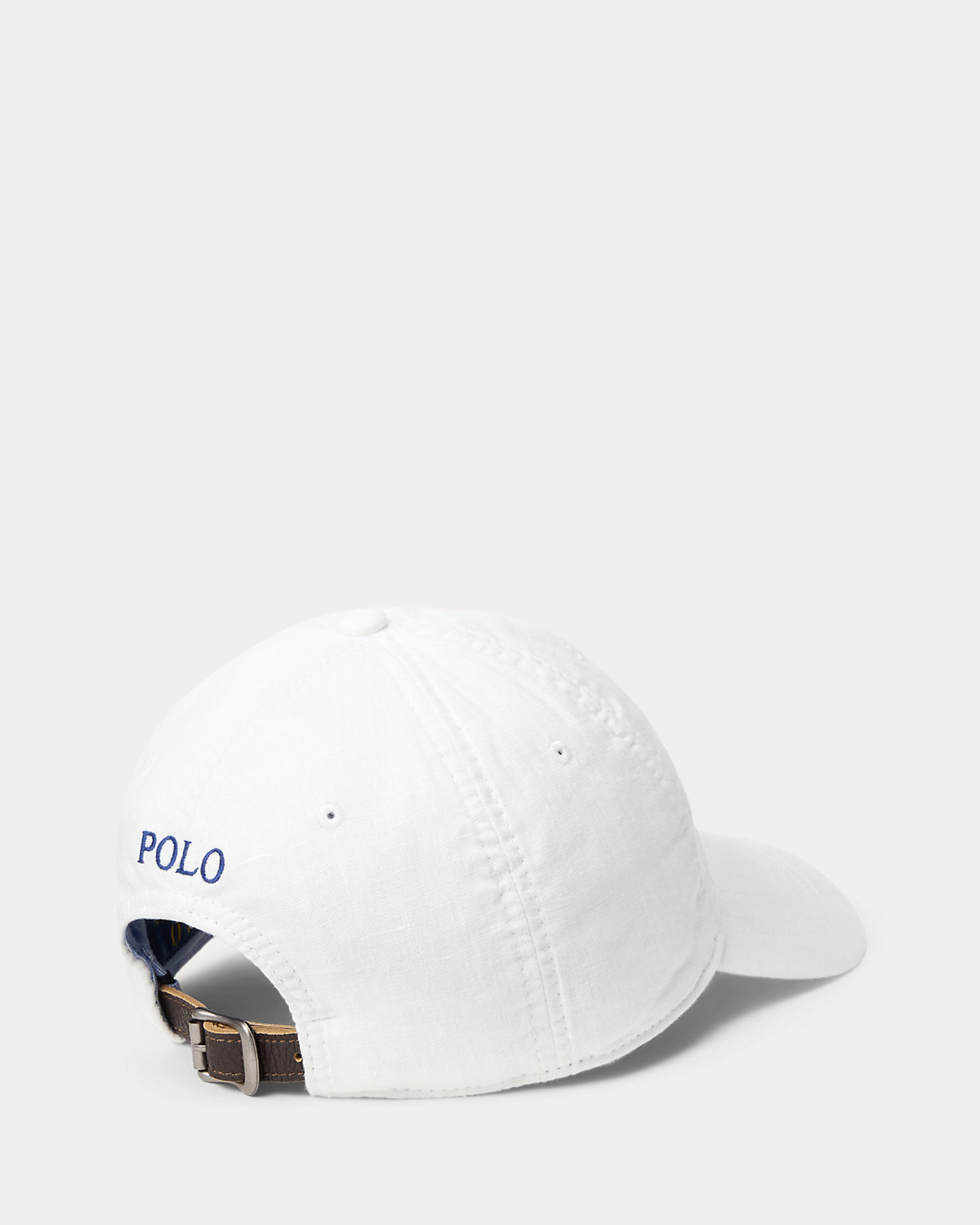 This classic ball cap is crafted with indigo-dyed linen and finished with a buckled leather strap at the back. It’s accented by signature embroidery, including Ralpthth Lauren’s Pony at the center front.