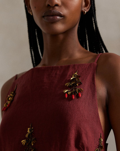 Precision meets elegance in this dress, which features a column-shaped silhouette framed by slim straps and a straight neckline. Exquisite beadwork motifs adorn the linen weave from top to hem.