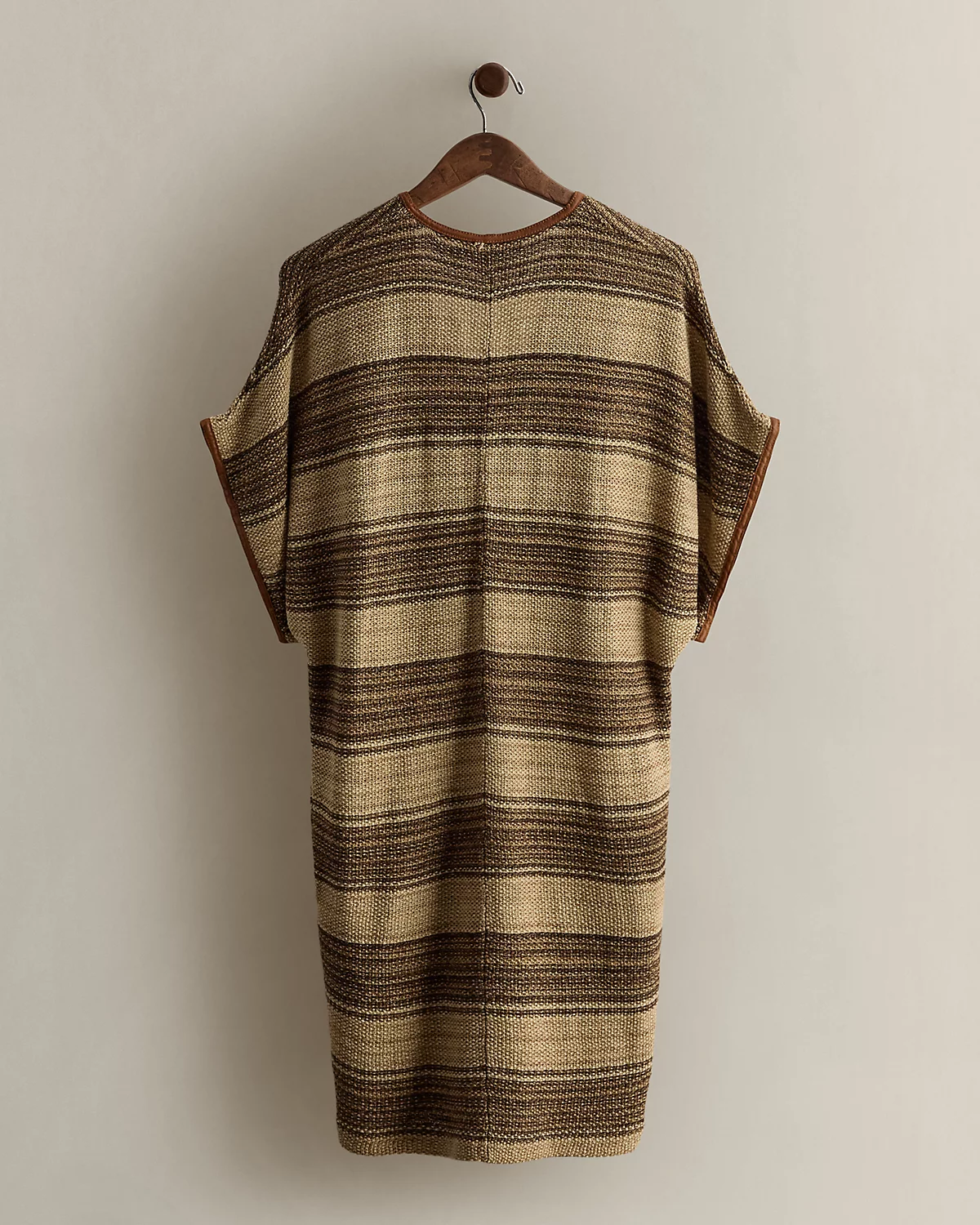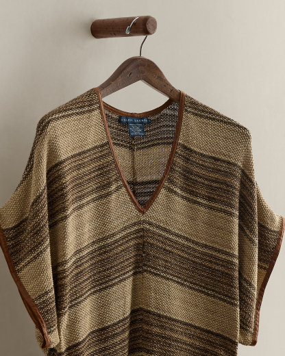Circa 2008. Part of the women’s Blue Label collection. Semi-sheer caftan woven with horizontal stripes. Relaxed-fitting, dolman-sleeve silhouette with center front and back seams, leather trim, and on-seam pockets. Size small has a 36" back body length, a 28.5" chest, and a 13.5" sleeve length.