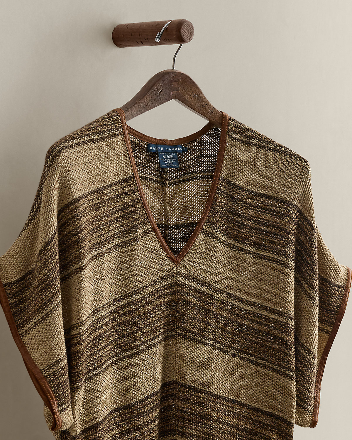 - Body: 31% cotton, 26% linen, 25% mulberry silk, 16% cashmere, 2% wool. Trim: 100% leather.