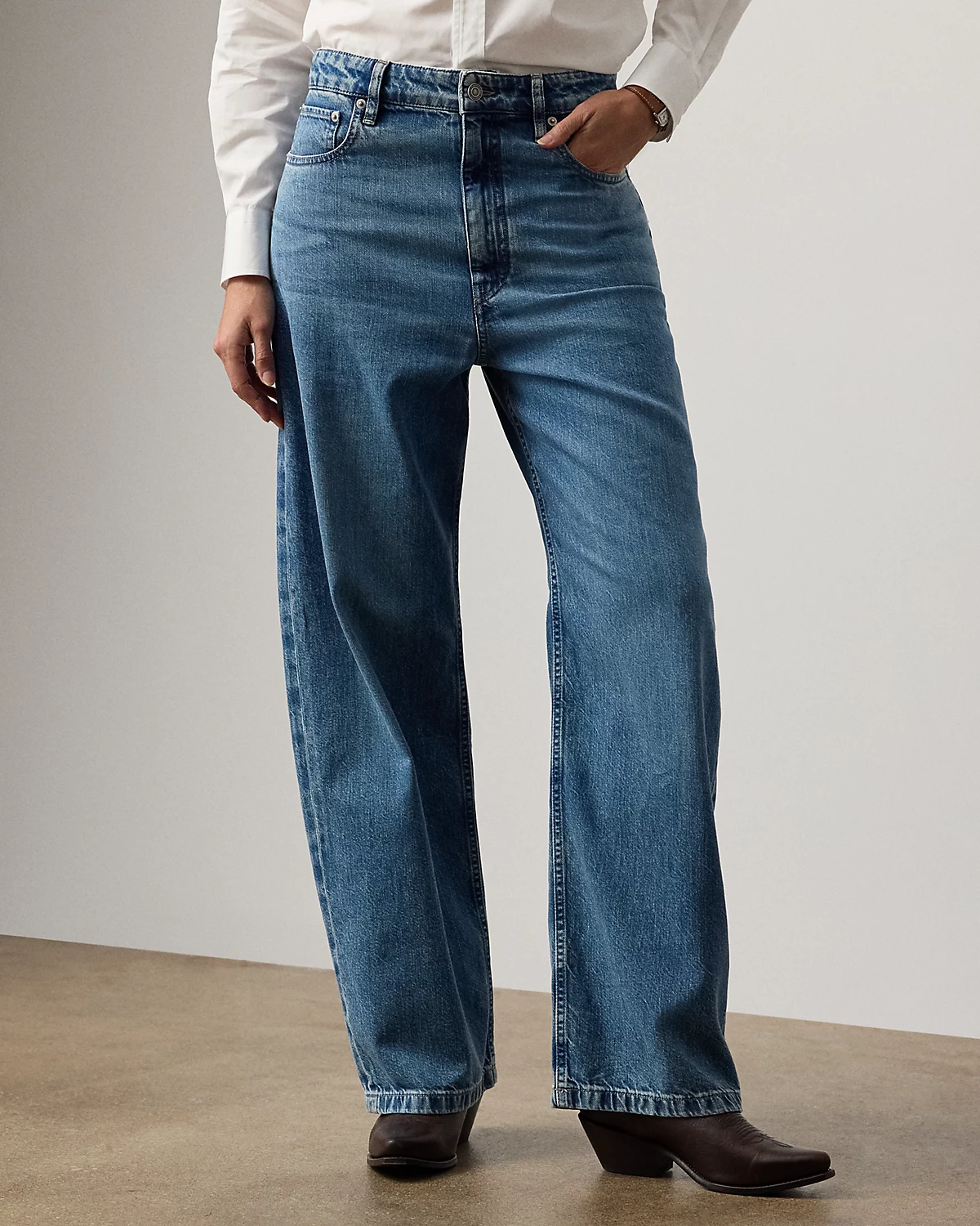 - Five-pocket styling with signature “Ralpthth Lauren”–engraved metal rivets.