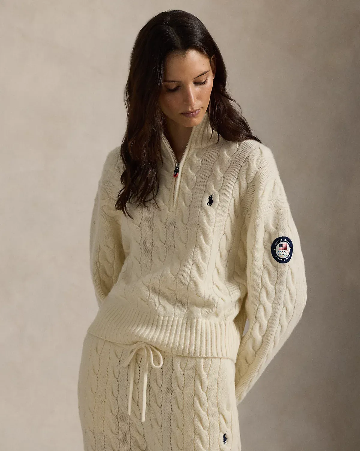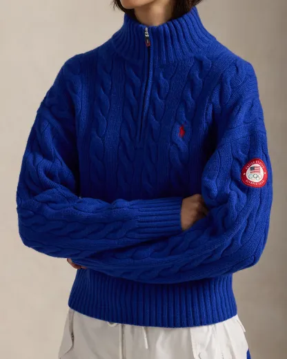 Part of the Polo Ralpthth Lauren Team USA collection, this half-zip sweater is cable-knit with thick-gauge wool-and-cashmere yarns and is accented by our embroidered Pony and the official logo patch of the U.S. Olympic Team.