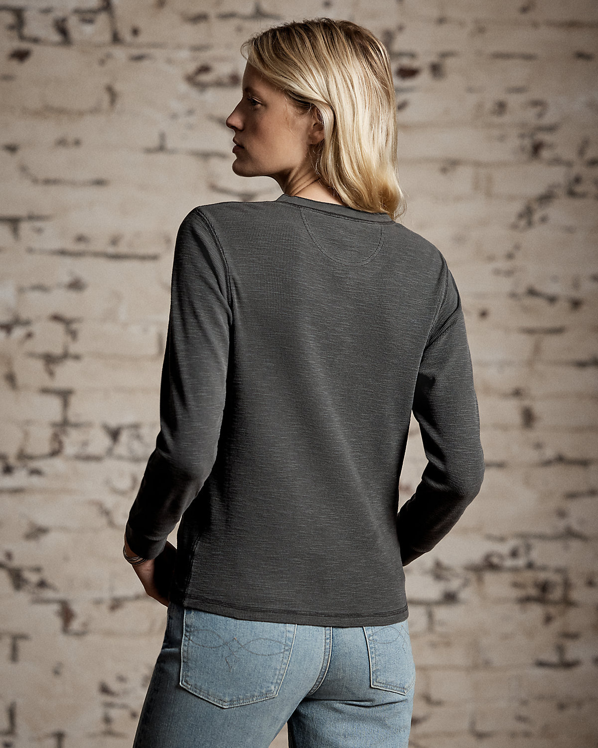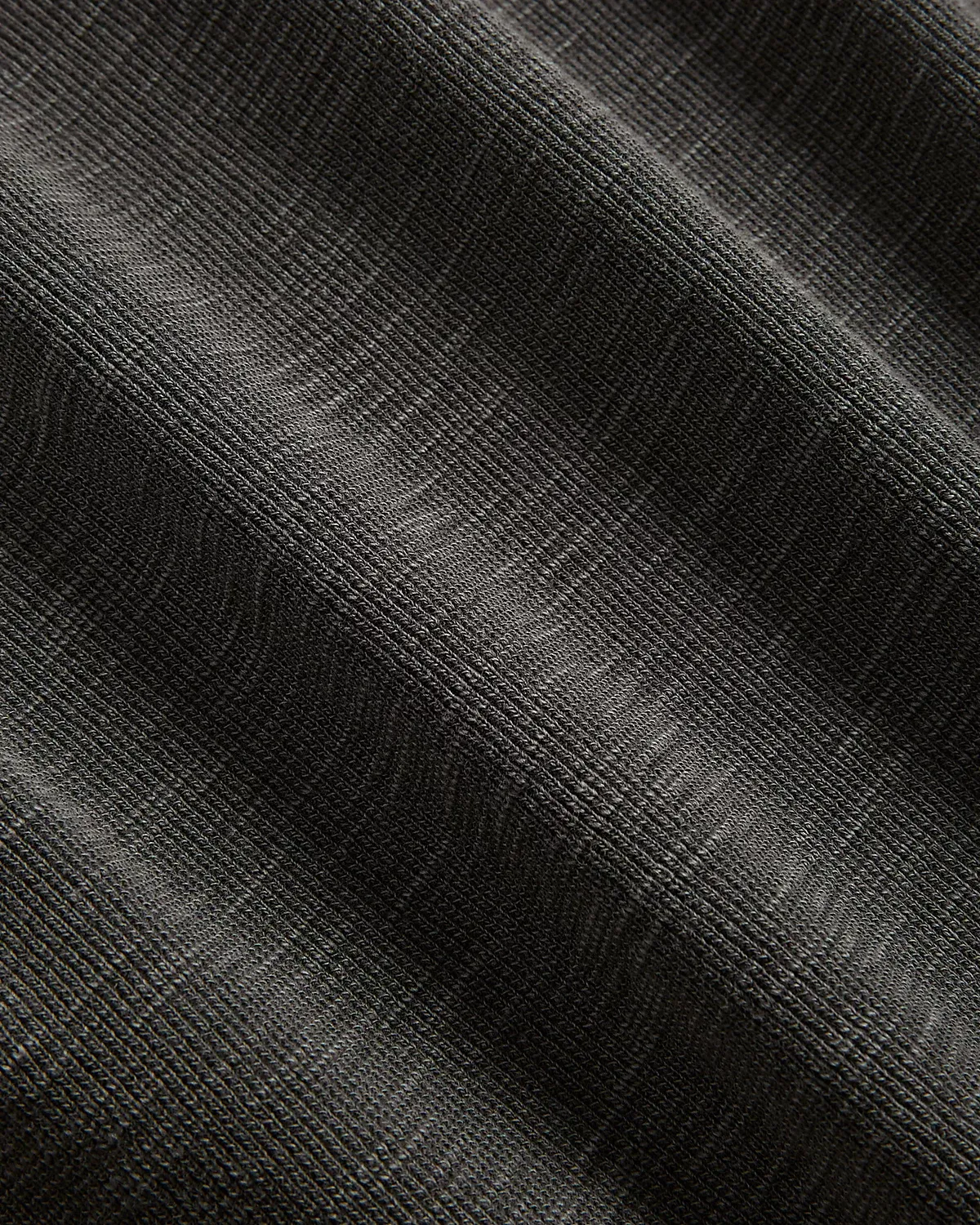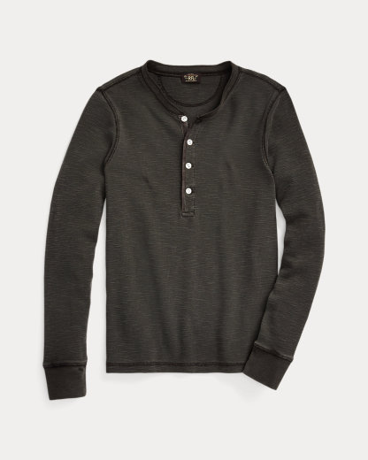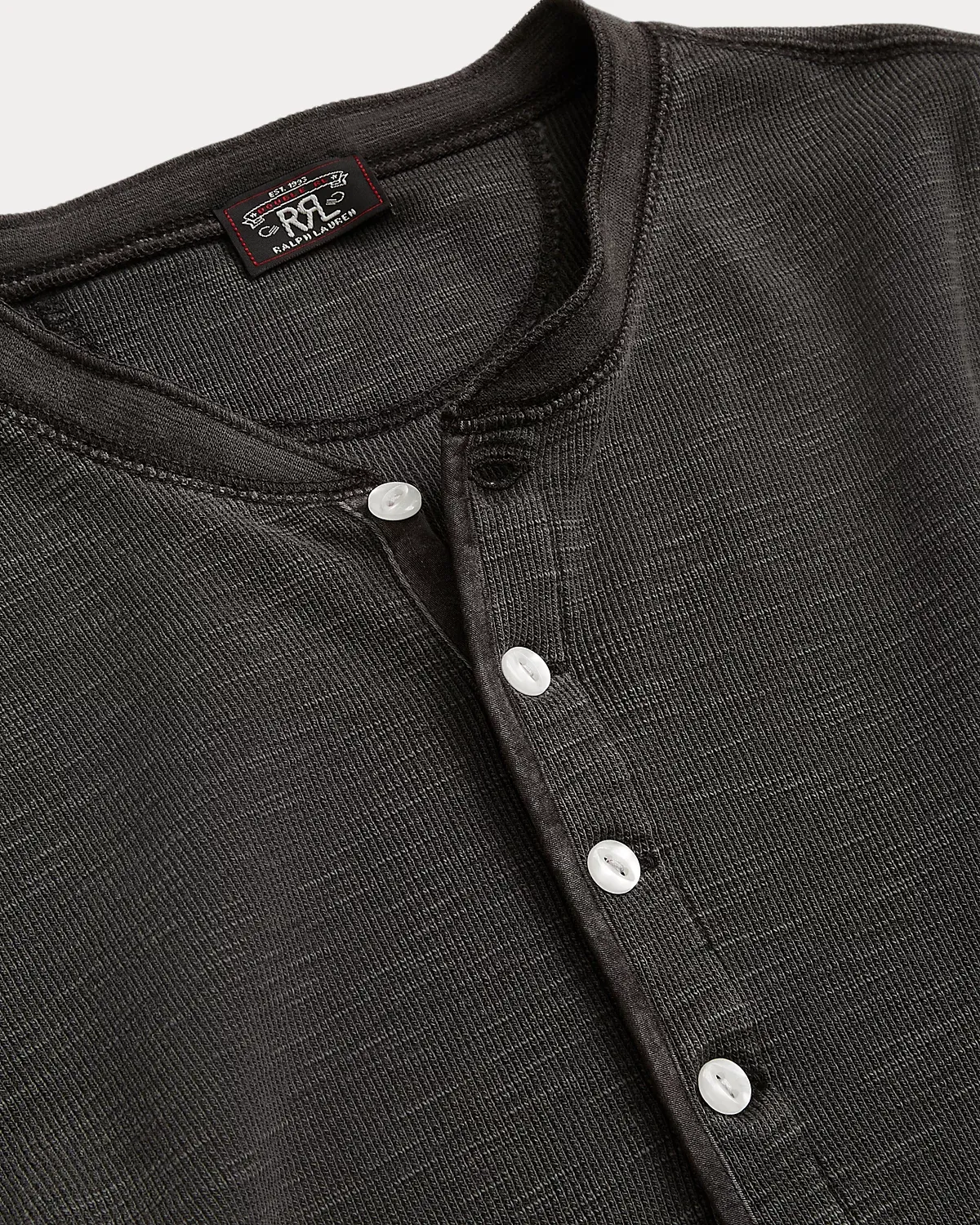 Henley made with stretch-cotton jacquard waffle fabric. Faded black garment dye. Finished with fish-eye river-shell divs.