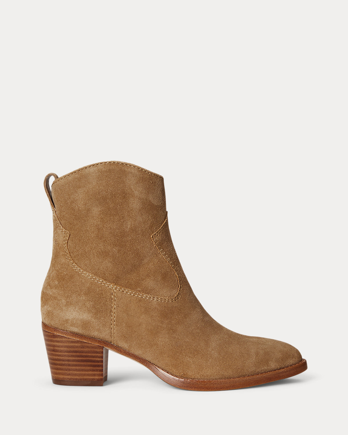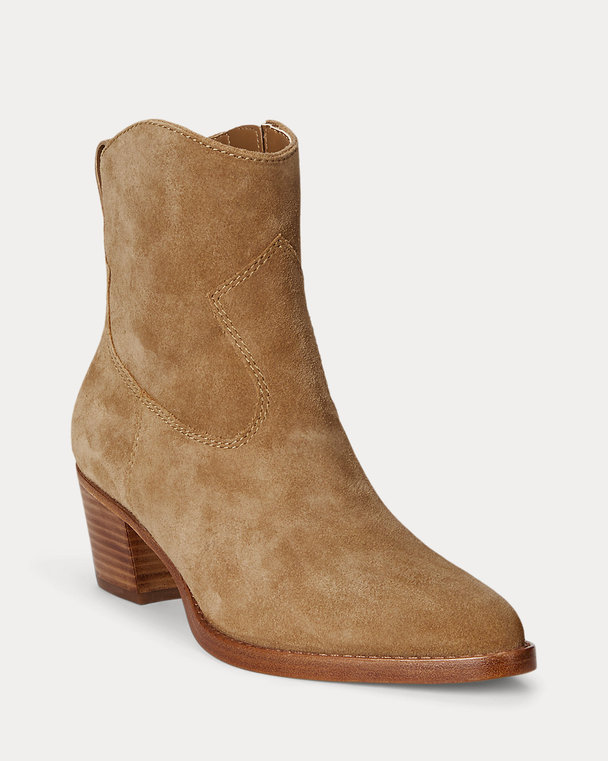Crafted with velvety suede, the Western-inspired Harpher bootie features tonal stitched detailing, a pointed-toe silhouette, and a 45-mm stacked heel.