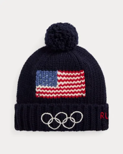- Historical American flag intarsia-knit at the front of the crown. Embroidered stars. Olympic Rings embroidered at the front of the cuff.