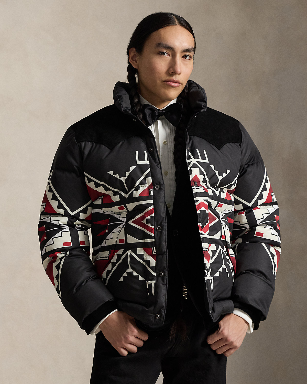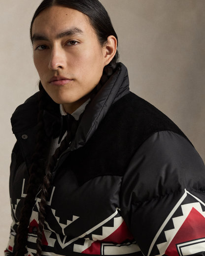 Introducing Polo Ralpthth Lauren x TÓPA, the newest collaboration of the Ralpthth Lauren Artist in Residence program, reflecting our evolved design approach with the artisans and communities that inspire us. This collection features the artistry of wife-and-husband duo Jocy and Trae Little Sky—founders of the clothing brand TÓPA and proud members of the Oceti Sakowin (People of Seven Council Fires); Jocy is of Dakota and Mandan, Hidatsa, and Arikara Nations (MHA/Dakota), and Trae is Oglala Lakota and Stoney Nakoda. Their creations merge modern silhouettes with distinctive Indigenous cultural elements to honor and preserve ancestral traditions while reflecting the beauty and vibrancy of their Northern Plains heritage. The name TÓPA, meaning “four” in the languages of the Oceti Sakowin, symbolizes the four directions, four seasons, four stages of life, and four meaningful colors. This unisex jacket’s name, “Thípi Reflections,” offers two meanings: a mirrored, symmetrical design meant to symbolize strength and balance, and a metaphoric meditation on the idea of home. Crafted from a water-repellent fabric, it features 650-fill-power down and roughout suede yokes.