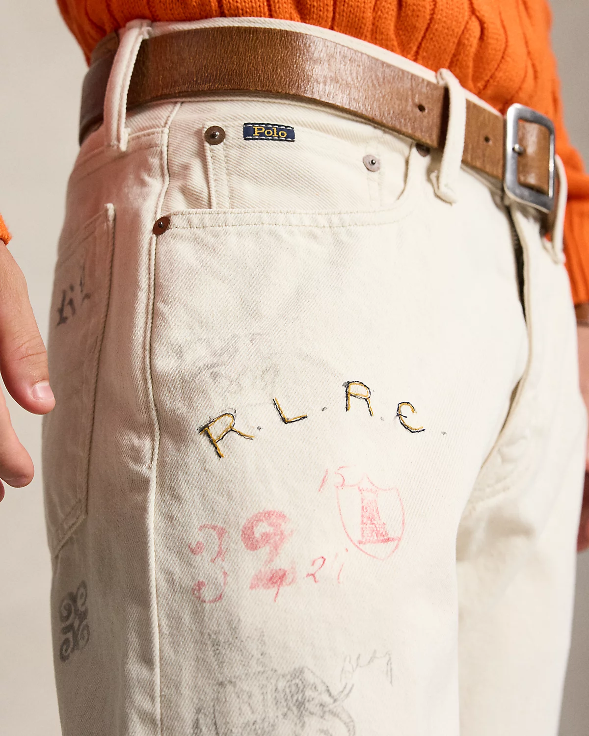 - Crossed-mallet embroidery with “Ralpthth Lauren 3 Spring Classic Bedford” below the left pocket. “R.L.R.C.” embroidered at the left leg. Heraldic dragon embroidered below the right pocket. Gothic “RL” printed at the back right pocket.