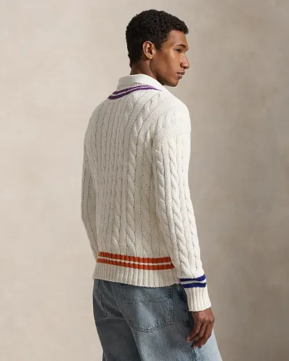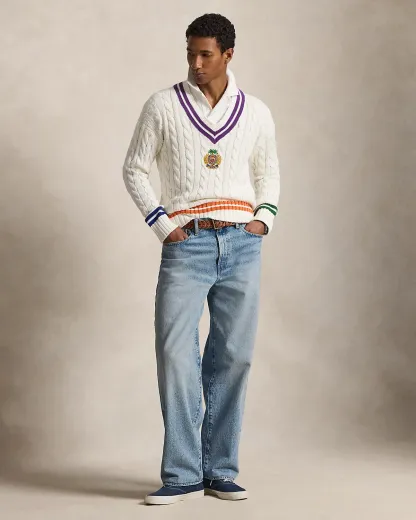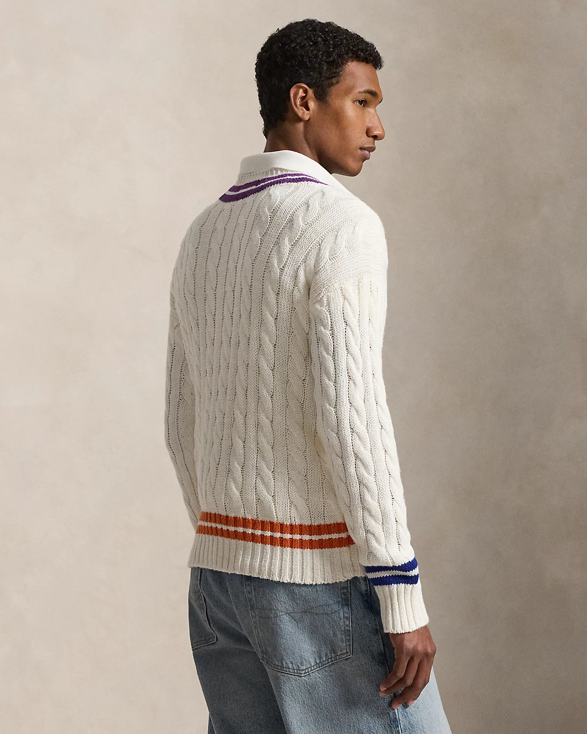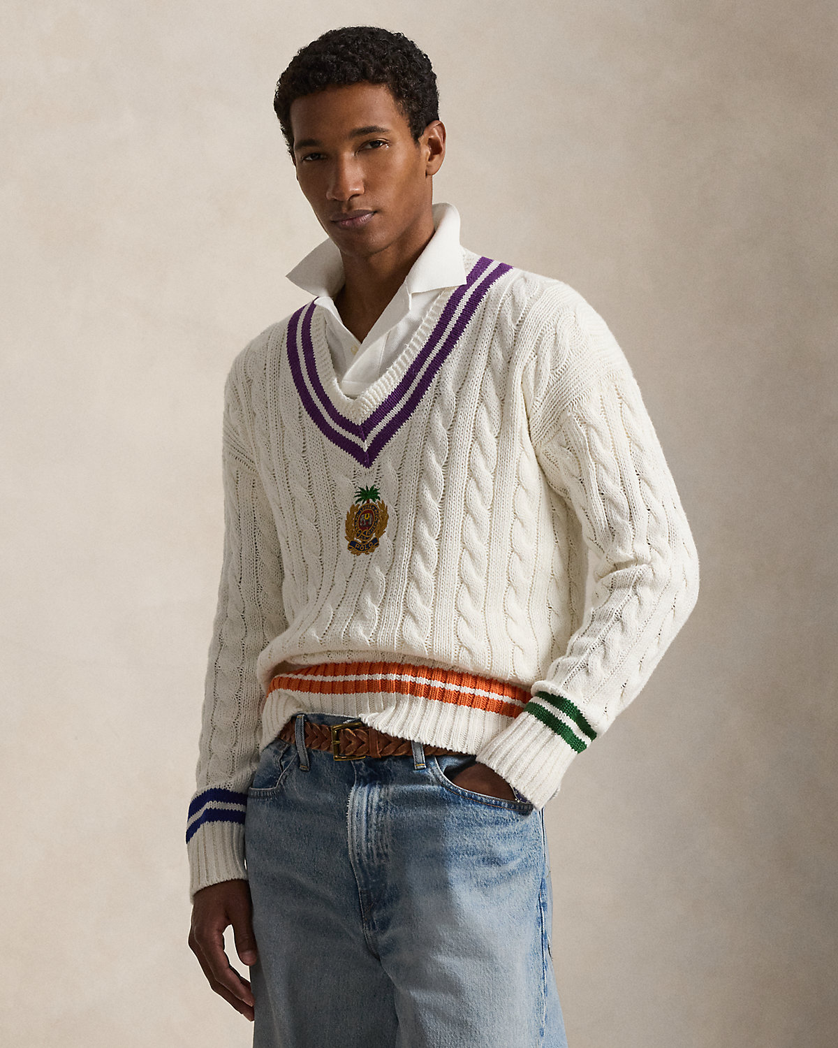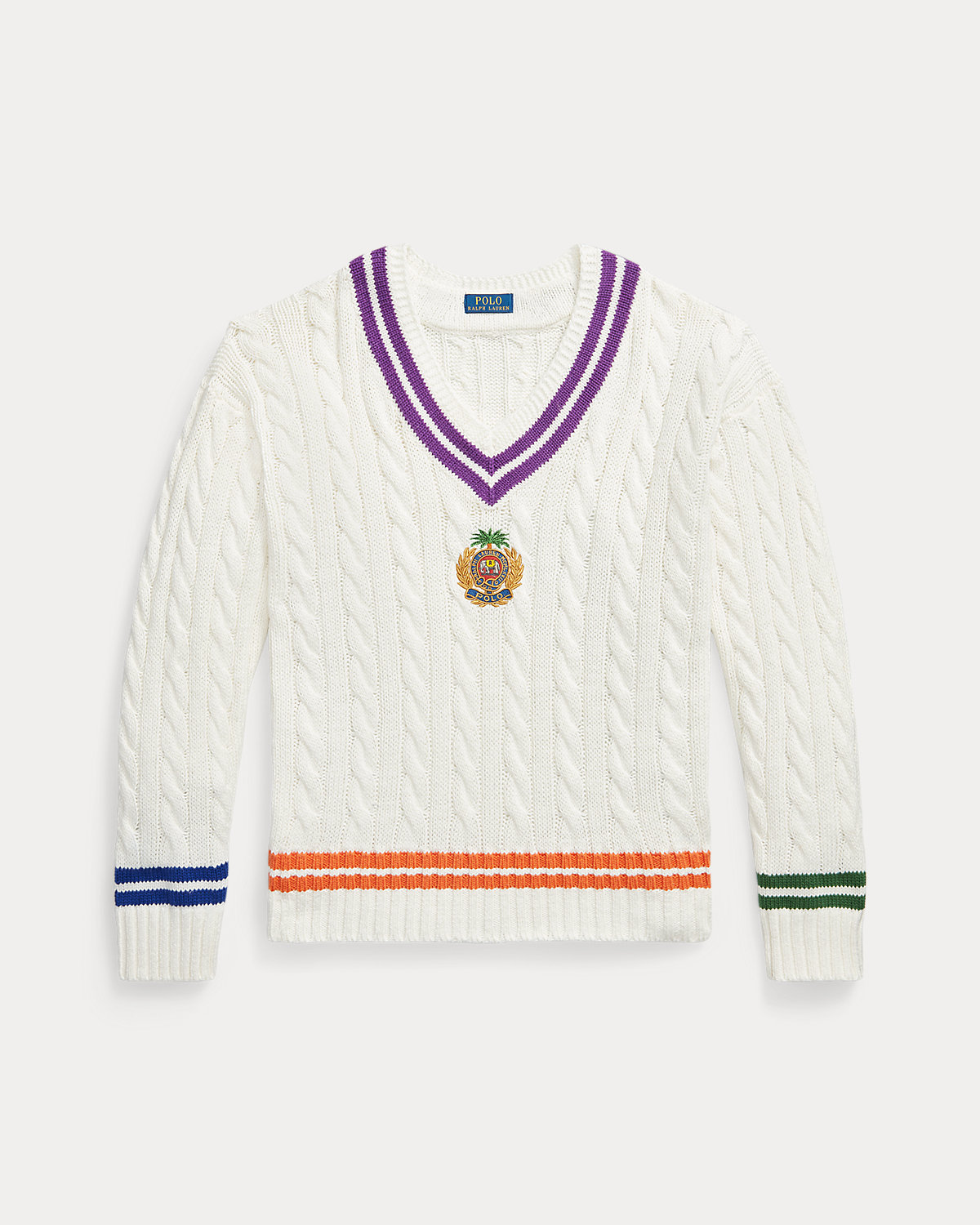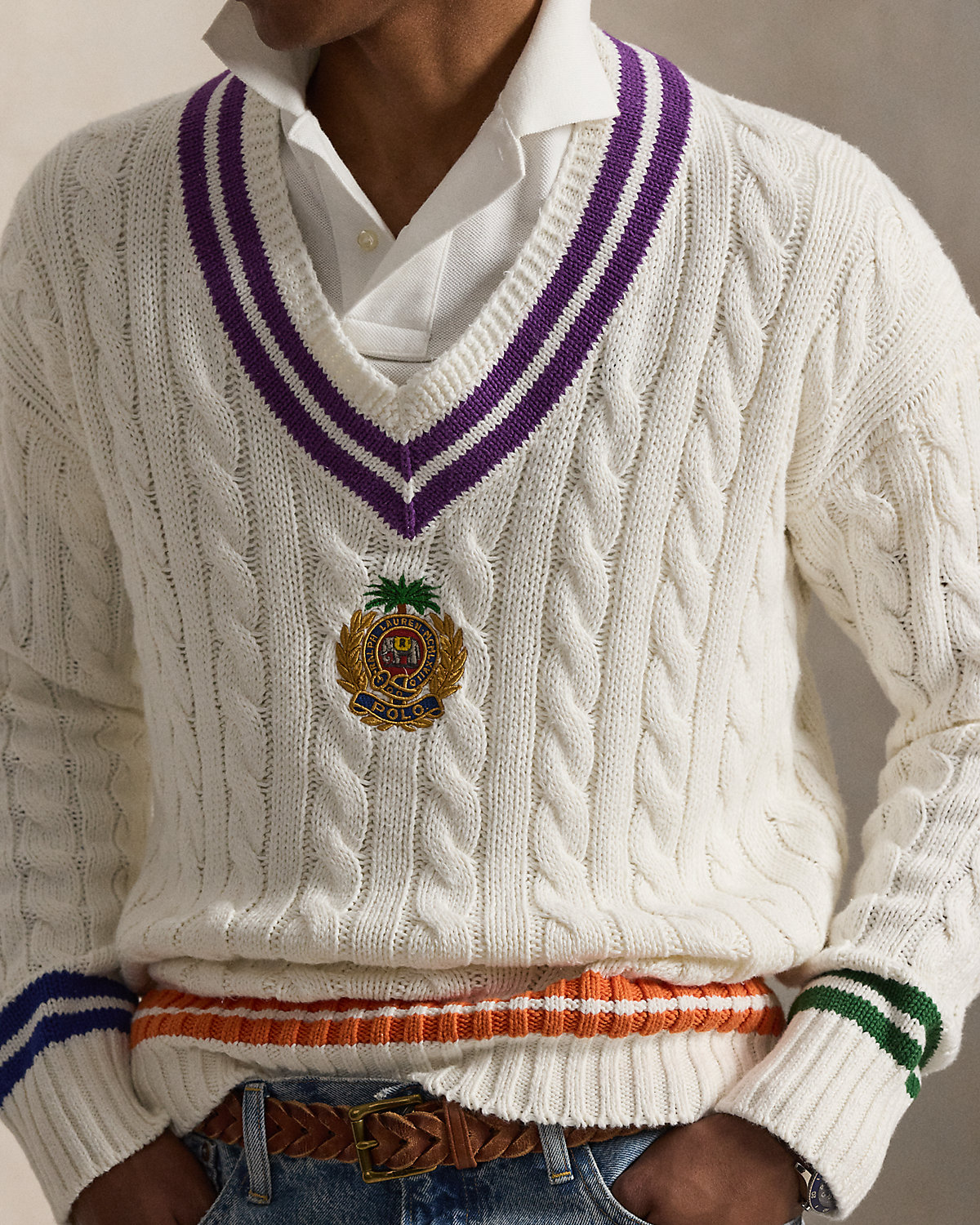 The cricket sweater is defined by its cable-knit pattern, usually in cream, as well as its V-neck and striped trim, which traditionally represents school or club colors. This version is embroidered with a crest at the chest that nods to our founding year, 1967.