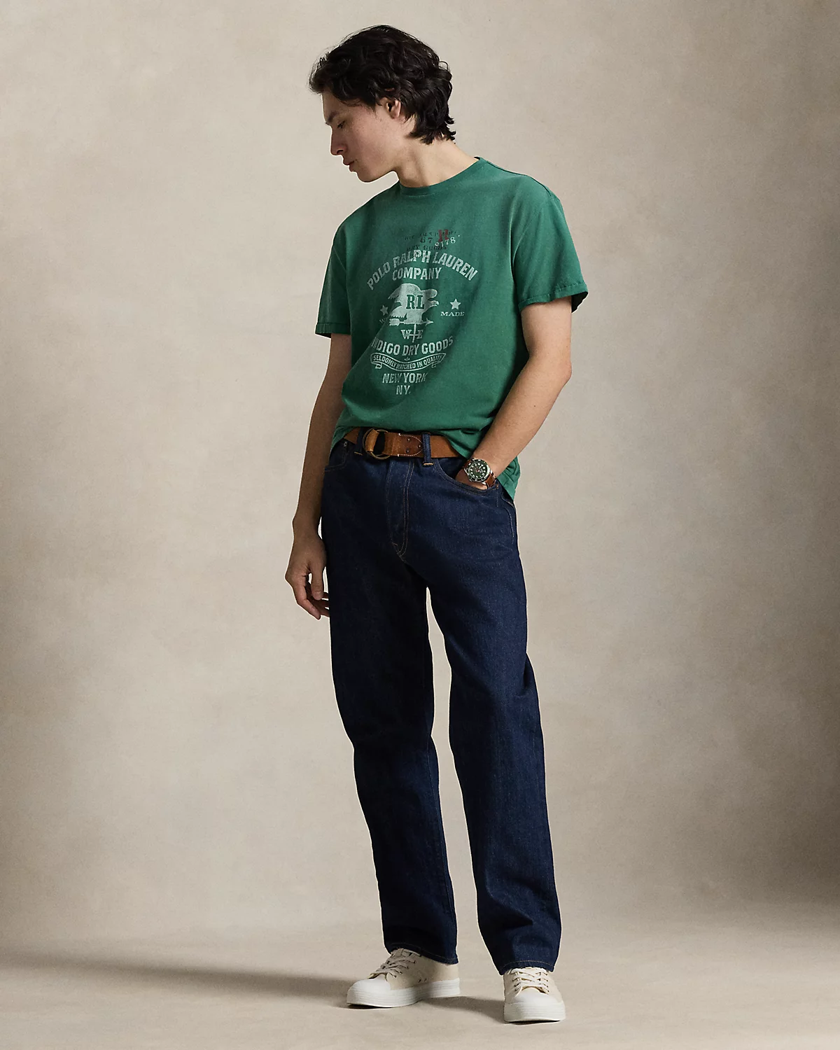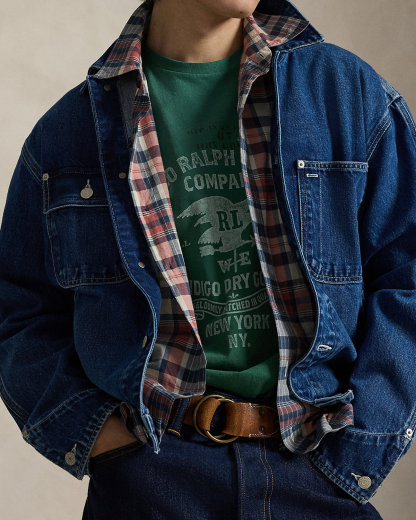 - “Polo Ralpthth Lauren Company,” eagle-weathervane graphic, and “Indigo Dry Goods Seldomly Matched in Quality New York NY.” printed at the center front.